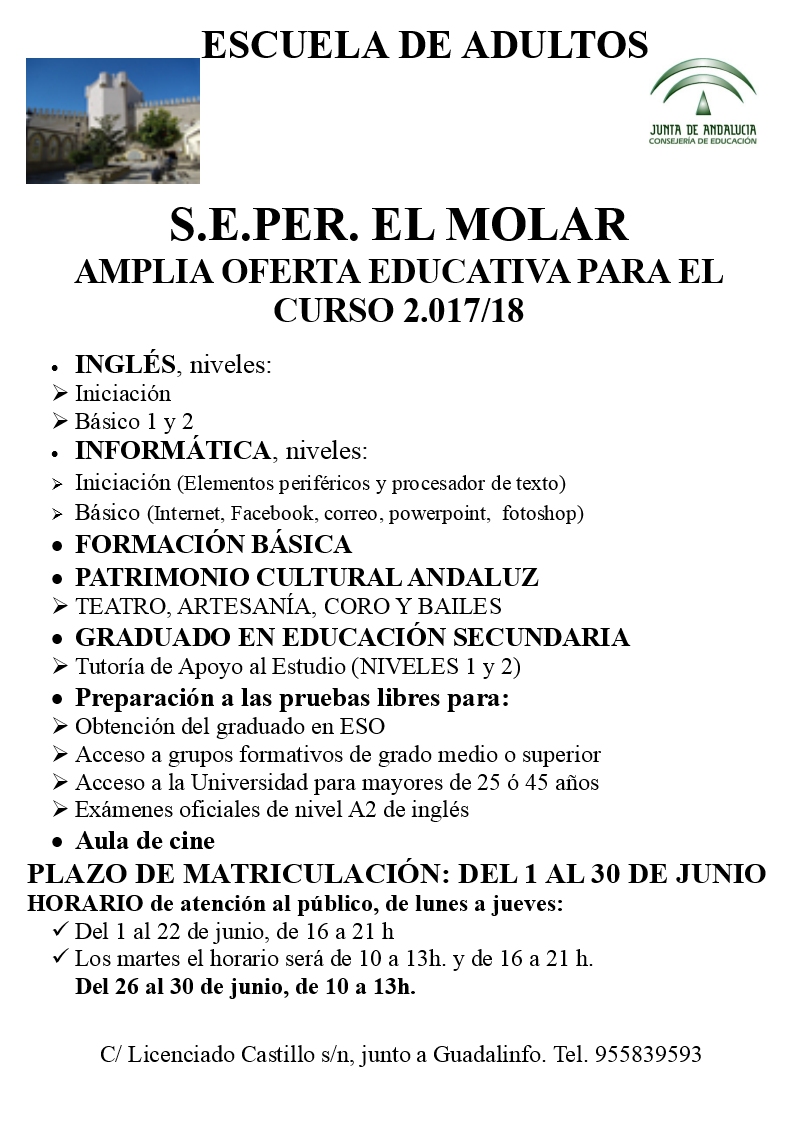 Imagen Ubicación Categoría noticia Educación Mostrar en el carrusel de la sección No Fecha Mar, 30/05/2017 - 14:31 Más información http://www.losmolares.es/es/actualidad/noticias/S.E.P.E.R.-EL-MOLAR-OFERTA-EDUC…
