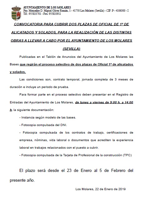 Imagen Ubicación Categoría noticia Formacion y Empleo Mostrar en el carrusel de la sección No Fecha Mar, 22/01/2019 - 11:51 Más información http://www.losmolares.es/es/actualidad/noticias/CONVOCATORIA-PARA-CUBRIR-DOS-PL…
