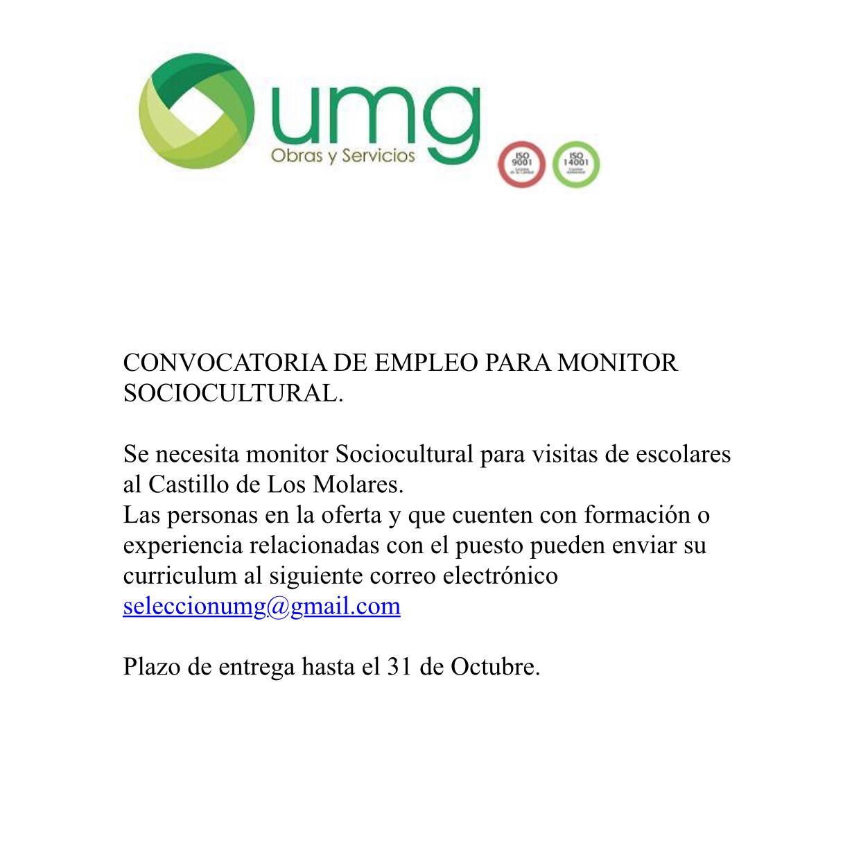 Imagen Ubicación Categoría noticia Formacion y Empleo Mostrar en el carrusel de la sección No Fecha Jue, 24/10/2019 - 12:11 Más información http://www.losmolares.es/es/actualidad/noticias/Oferta-de-empleo-00006/