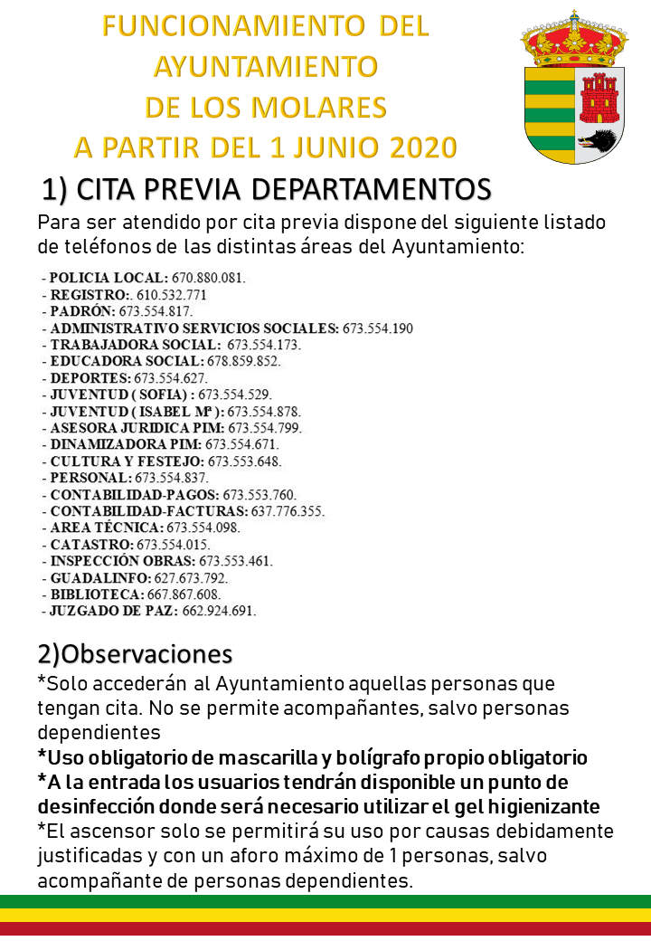 Imagen Imágenes Ubicación Categoría noticia Participación Ciudadana Mostrar en el carrusel de la sección No Fecha Lun, 08/06/2020 - 11:42 Más información http://www.losmolares.es/es/actualidad/noticias/FUNCIONAMIENTO-AYTO-LOS-MOLARES…