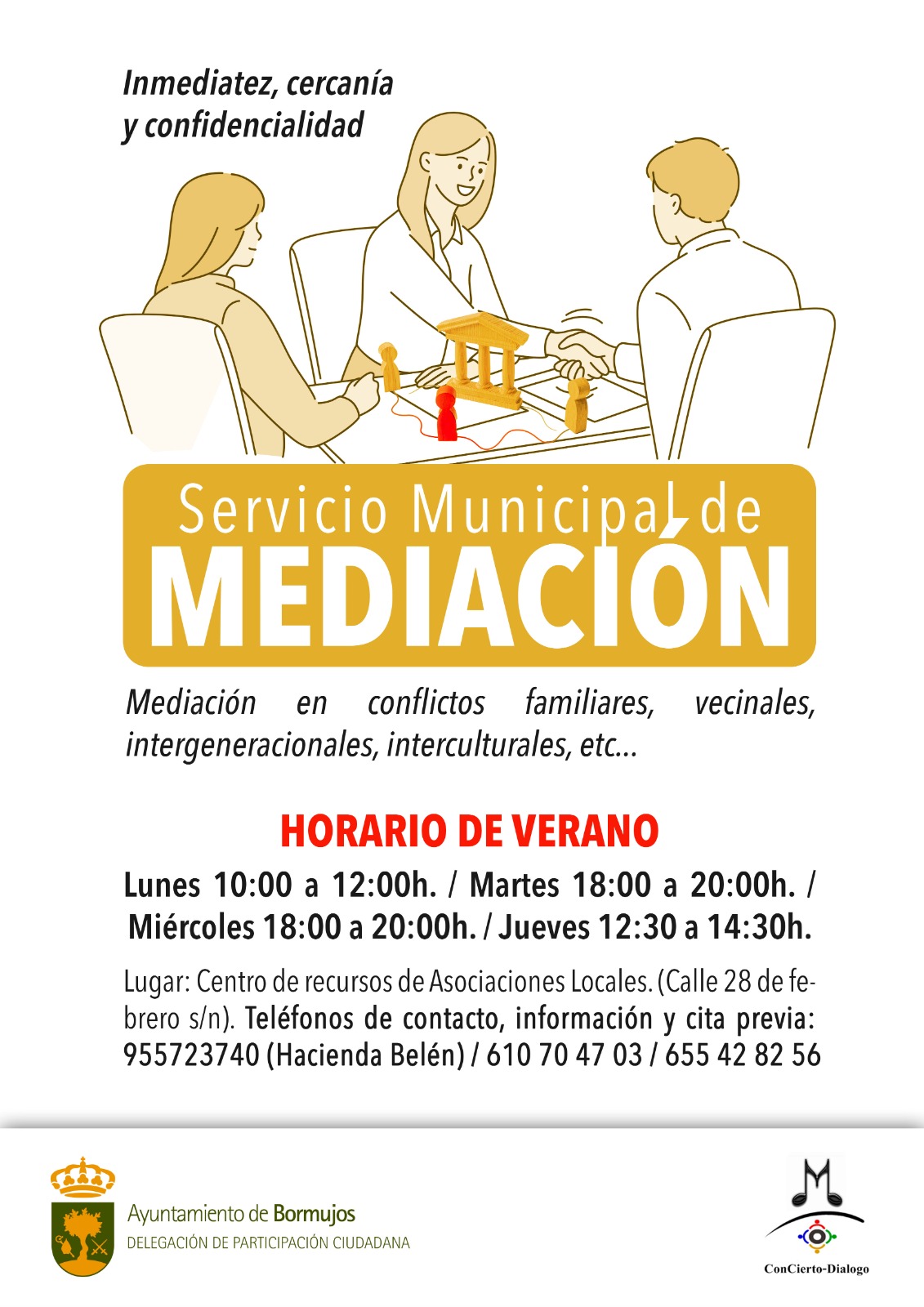 Con un trato en el que se garantiza la inmediatez, cercanía y confidencialidad, los profesionales del derecho de la Asociaciaón Mediación Bormujos atenderán en el Centro de Asociaciones C/ 28 febrero s/n.
