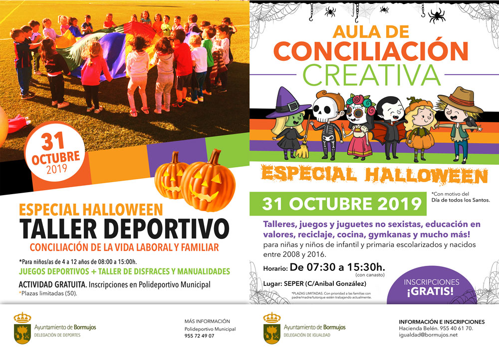 El próximo jueves 31 de octubre, con motivo del festivo escolar, el Ayuntamiento de Bormujos, a través de las Delegaciones de Igualdad y de Deportes, te ofrece dos estupendas alternativas para que tus hijas e hijos puedan disfrutar de una divertida mañana mientras tu vas a trabajar. Dos opciones gratuitas para ayudar a conciliar la vida laboral y familiar: