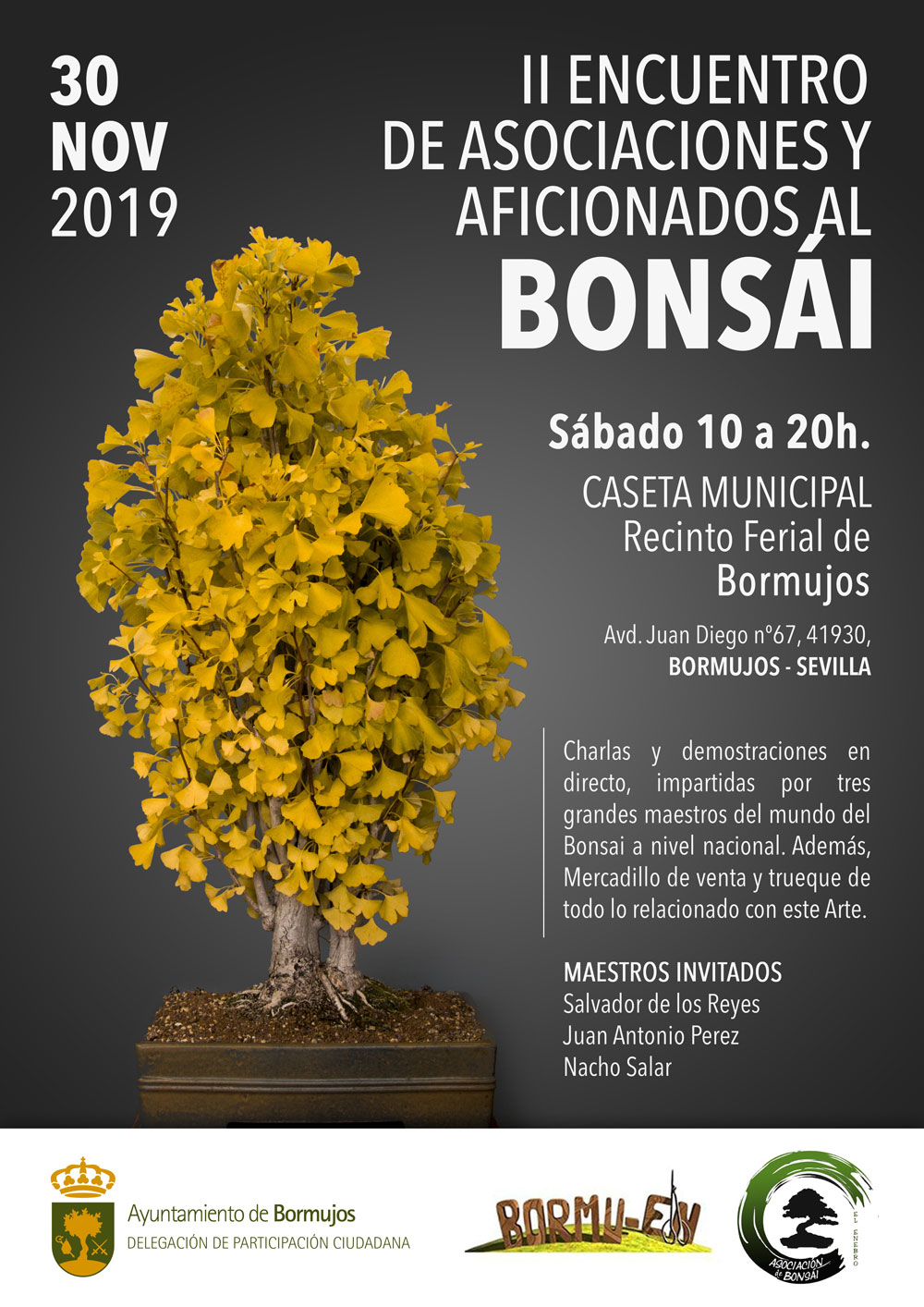 El próximo sábado 30 noviembre la Asociación Bormu en celebra el II Encuentro de Asociaciones y Amigos del Bonsái en la Caseta Municipal, en colaboración con el Ayuntamiento de Bormujos, a través de la Delegación de Participación Ciudadana.