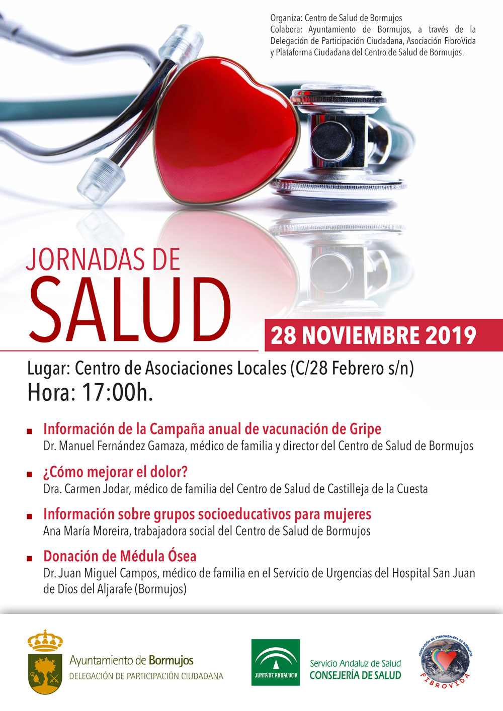 El Centro de Salud "Dr Pérez Vega" de Bormujos organiza una "Jornada de Salud" en colaboración con el Ayuntamiento de Bormujos, la Asociación Fibrovida y la Plataforma Ciudadana del Centro de Salud.
