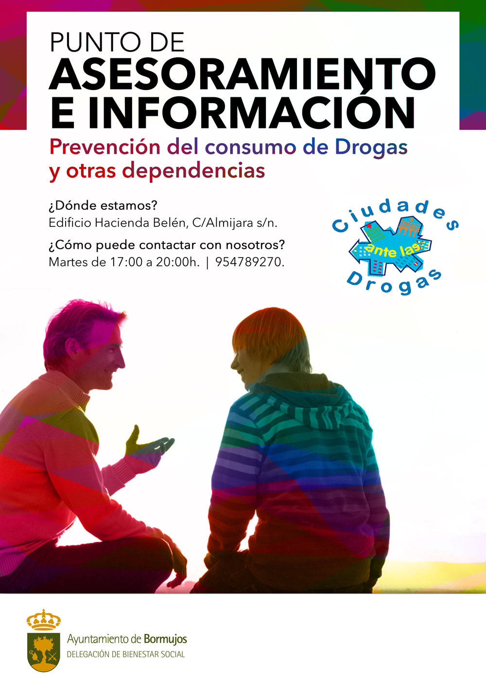 drogas, se pone en marcha el "Punto de Asesoramiento e Información" ; para todas las familiasdel municipio con el fin de prevenir y reducir el consumo de drogas en los/as jóvenes. Este recurso es un servicio gratuito que está destinado especialmente a los padres y madres que desean realizar alguna consulta para mejorar sus acciones educativas y prevenir el consumo de sustancias en sus hijos/as durante la adolescencia, así como a jóvenes que desean conocer los