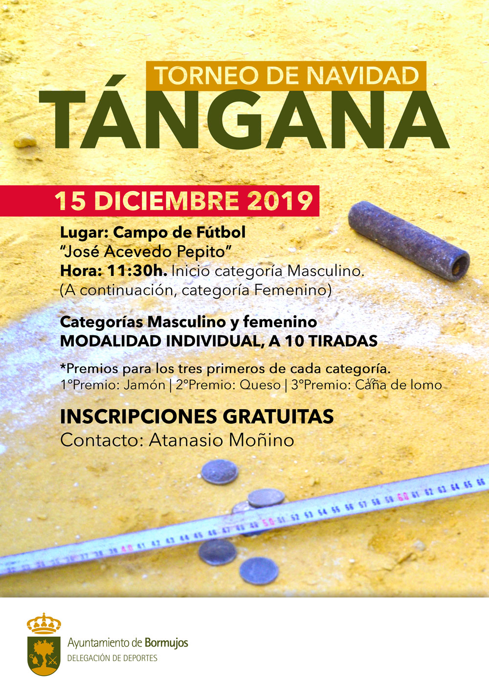 El próximo domingo 15 de diciembre se celebra en el Campo de Fútbol del Polideportivo Municipal el Torneo de Tángana de Navidad. Será para las categorías masculino y femenino en modalidad individual con 10 tiradas.