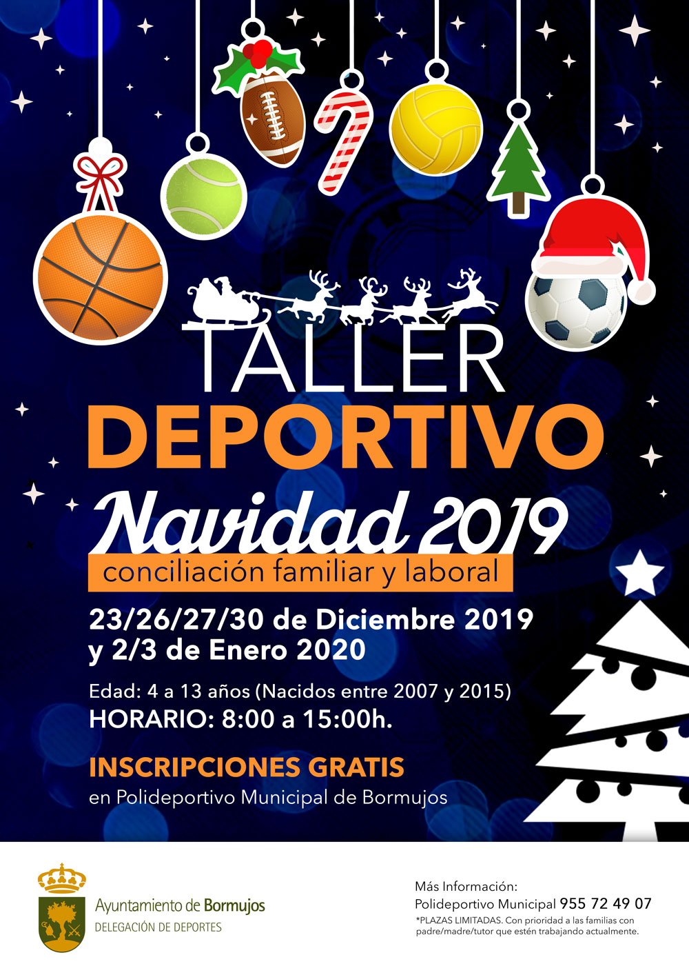 Si trabajas durante las fiestas navideñas y quieres que tus hijas/os pasen una divertida mañana haciendo deporte, manualidades y pasándolo bien, apúntales al Taller Deportivo de Navidad 2019 organizado por la Delegación de Deportes.