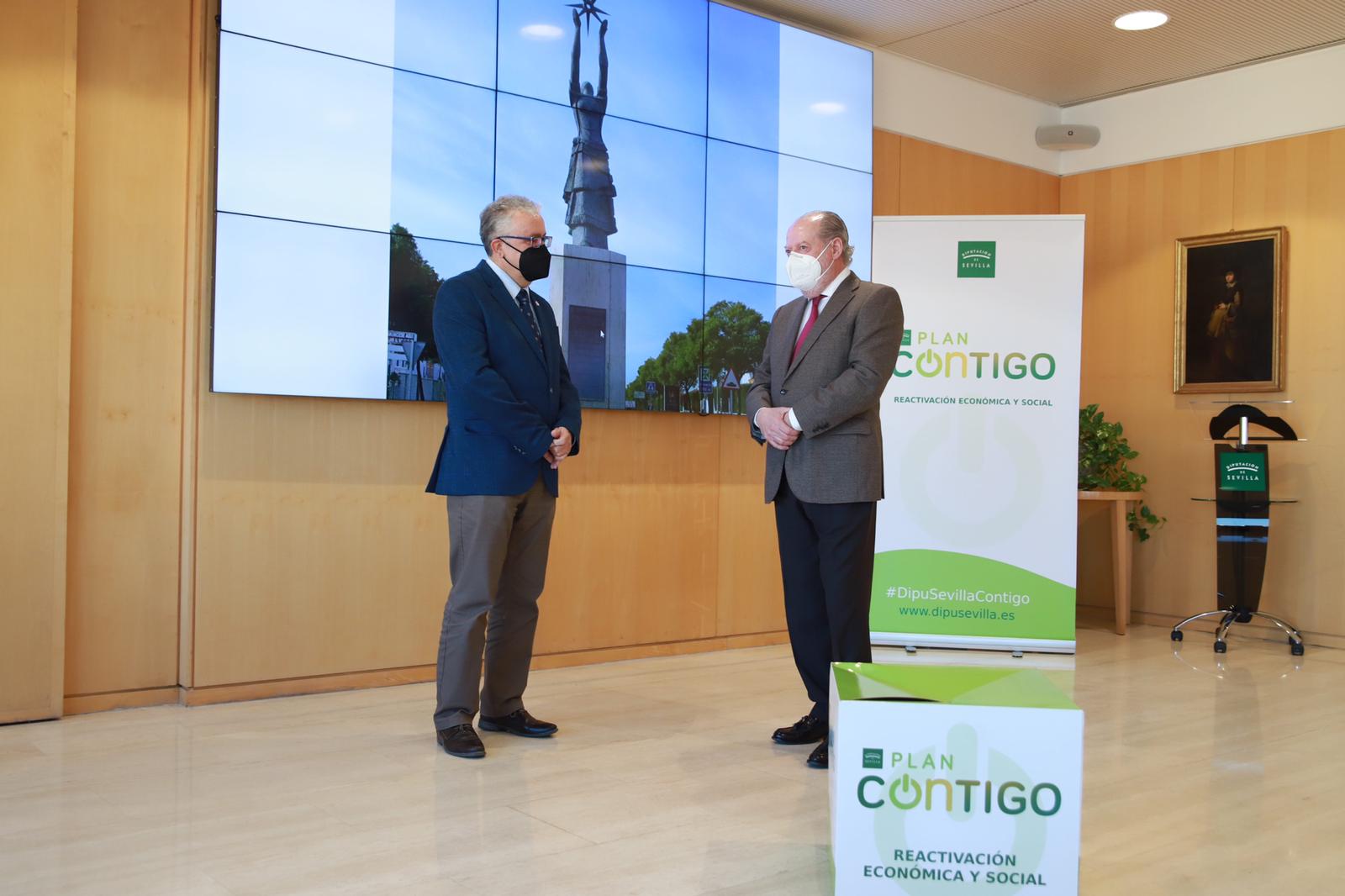 El presidente Villalobos ha resaltado los proyectos innovadores que Bormujos viene realizando en los últimos años, 'contribuyendo así a la transformación del municipio junto al resto de la provincia', y ha trasladado al alcalde de Bormujos 'la agradable noticia producida tras conocer que la liquidación del Presupuesto de 2020 de la Diputación se ha cerrado con un remanente de tesorería positivo de 450,8 millones de euros, lo que va a permitir que al menos 100 millones de euros se sumen a los bloques de empleo e inversiones del Plan Contigo'.
