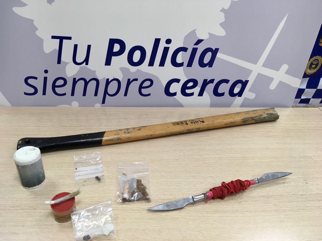 Inspeccionado el vehículo, se interviene el mango de madera de un hacha sin la hoja cortante así como dos cuchillos unidos por sus respectivas empuñaduras, lo que aumentaría en su caso la lesividad de la manipulación de ambas armas blancas.