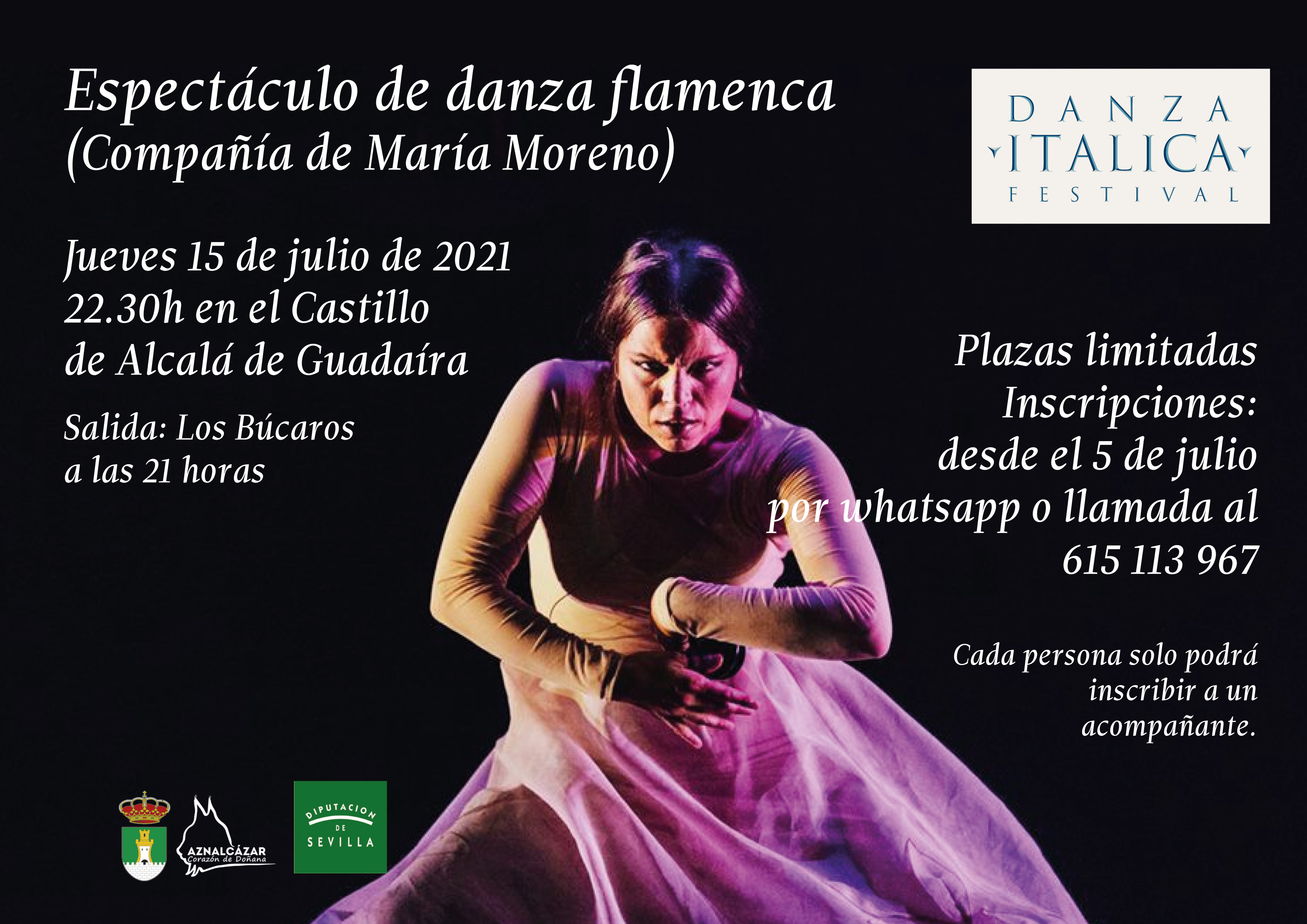 Desde el área de Cultura Aznalcázar se está organizando, con la colaboración de Diputación de Sevilla, la asistencia al Festival de Danza para el próximo 15 de julio en el Castillo de Alcalá de Guadaíra. Se trata del espectáculo de la bailaora María Moreno que dará comienzo a las 22.30h (la salida de Aznalcázar será a las 21:00h) Inscripciones: DESDE EL 5 DE JULIO, mandando un mensaje de whatsapp o llamando al 615 113 967. (Cada persona sólo podrá inscribir a un acompañante)