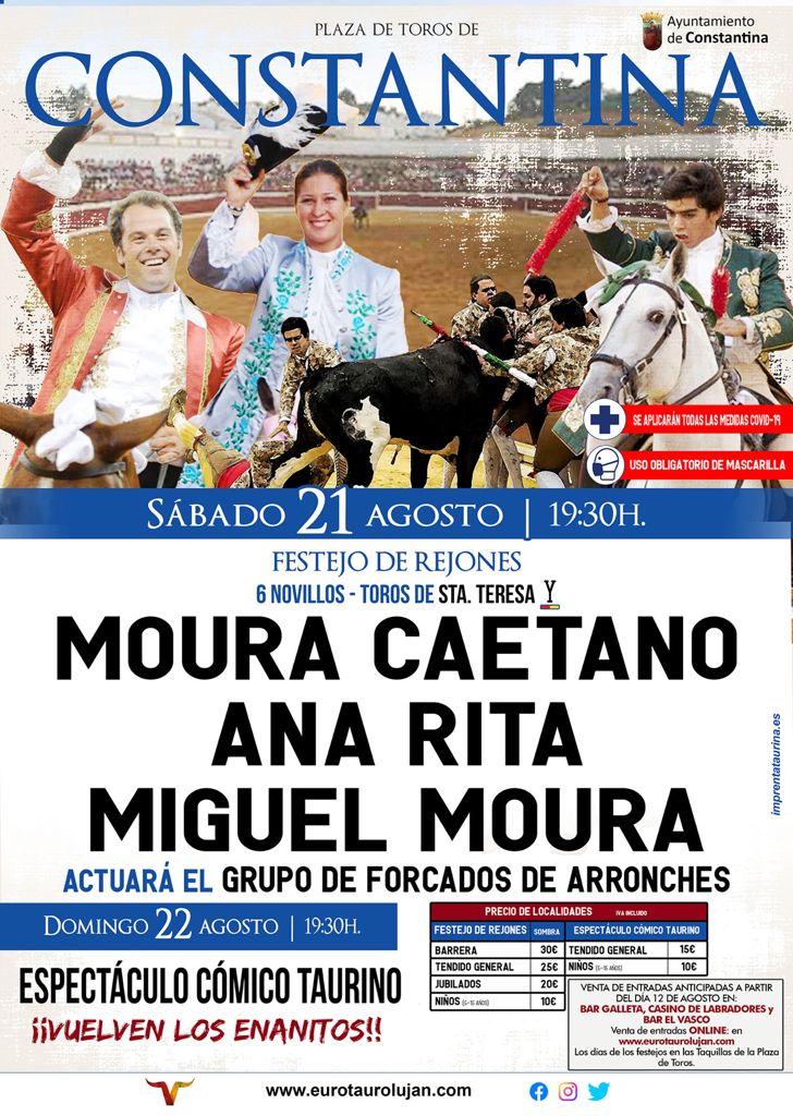 Organizado por Euro Tauro Luján, S.L. en colaboración con el Ayuntamiento de Constantina, el próximo sábado 21 de agosto, a las 19:30 horas en la Plaza de Toros de Constantina, se celebrará un grandioso Festejo de Rejones en los que las figuras del toreo a caballo, Moura Caetano, Ana Rita y Miguel Moura lidiarán 6 novillos-toros de la ganadería Santa Teresa.