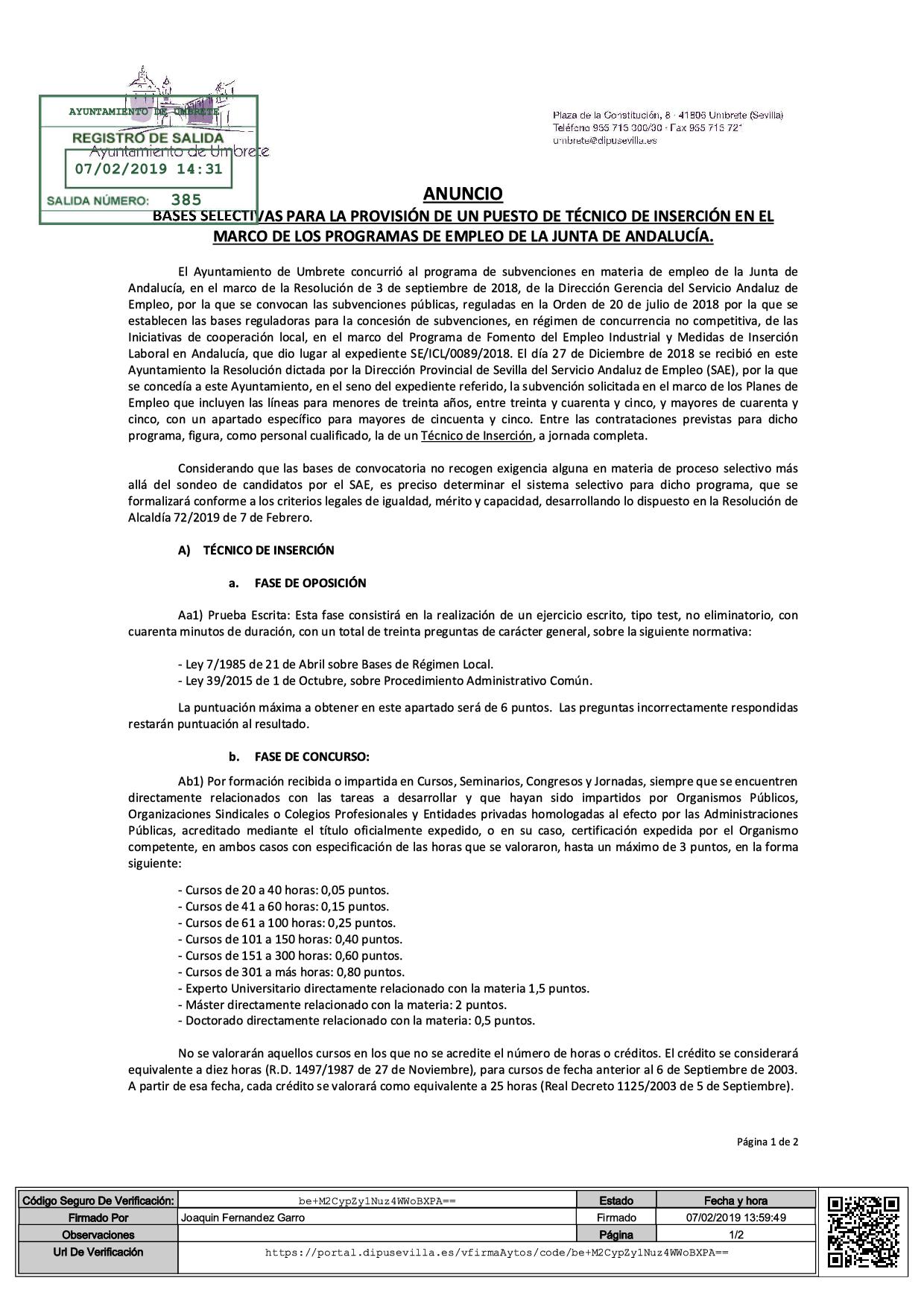 Imagen Ubicación Categoría noticia Empleo Mostrar en el carrusel de la sección No Fecha Jue, 07/02/2019 - 18:35 Más información http://www.umbrete.es/es/actualidad/noticias/BASES-SELECTIVAS-PARA-EL-PUESTO-DE…
