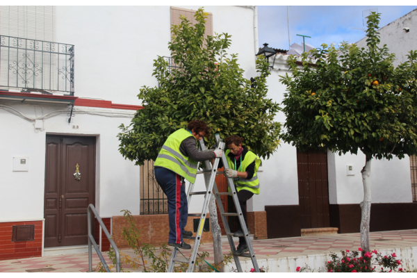 A través del personal contratado por Iniciativa Cooperación Social y Comunitaria Emple@30 y Emple@Joven en el sector de la jardinería, se están llevando a cabo labores de poda y recogida de elementos vegetales de arbustos, plantas y árboles en los parques, plazas y zona ajardinada de la vía pública. Estas actuaciones están financiadas por la Junta de Andalucía y por el Fondo Social Europeo procedente del Programa Operativo FSE Andalucía 2014-2020 y por el Fondo Social Europeo procedente del Programa Operativo de Empleo Juvenil respectivamente.