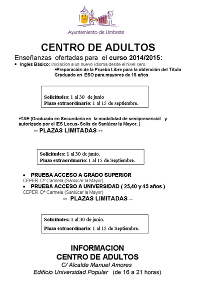 El Centro de Adultos de Umbrete ha hecho pública las enseñanzas ofertadas para el próximo curso académico 2014/2015.