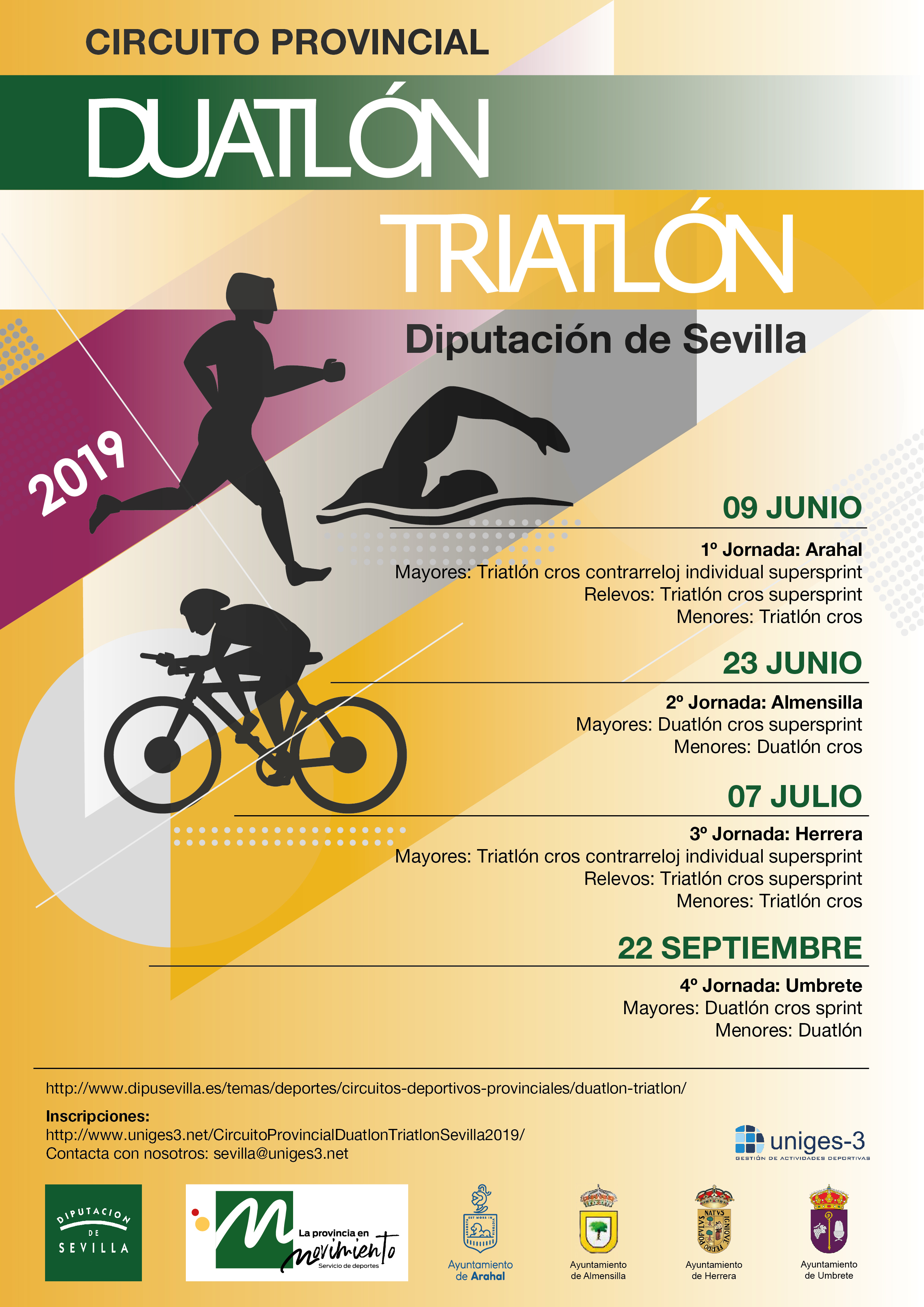 Más información en la página web de la Diputación de Sevilla y en la web Uniges-3: http://www.uniges3.net/CircuitoProvincialDuatlonTriatlonSevilla2019/