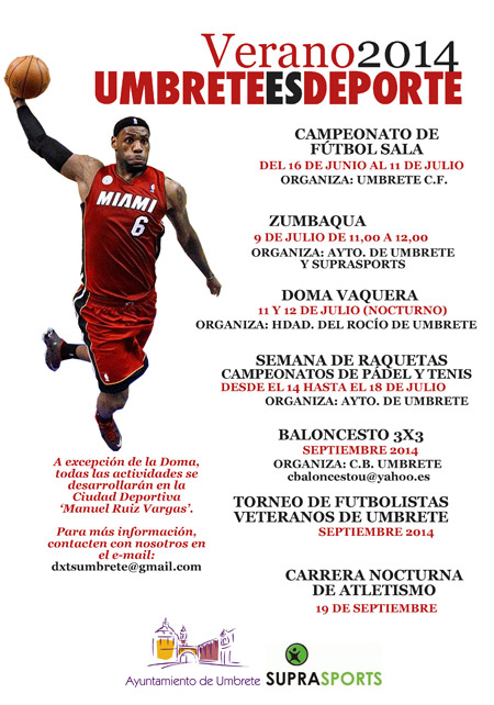 La Delegación de Deportes del Ayuntamiento de Umbrete, con la colaboración de clubes y empresas deportivas como Suprasports, ha organizado un completo programa de actividades deportivas para el verano que ya está en marcha. El 16 de junio arrancó el Campeonato de Fútbol Sala, que se prolongará hasta el 11 de julio. Posteriormente, el próximo 9 de julio, tendrá lugar una actividad de Zumbaqua. Posteriormente, organizado por la Hermandad del Rocío, tendrá lugar los días 11 y 12 de julio un concurso de Doma Vaquera. Y desde el 14 hasta el 18 de julio se celebrará la Semana de Raquetas, con competiciones por parejas de pádel e individuales de tenis.