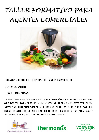 El próximo 9 de abril tendrá lugar, a las 19:00, un taller formativo en el Salón de Plenos del Ayuntamiento de Umbrete. El objeto del mismo será formar a vecinos y vecinas de nuestra localidad como agentes comerciales de la marca Thermomix. Está dirigido fundamentalmente a personas con entre 25 y 50 años con carácter abierto y dotes comunicativas. Esta iniciativa, para la que el Ayuntamiento ha cedido sus instalaciones, está organizada por Thermomix y por Vorwerk.