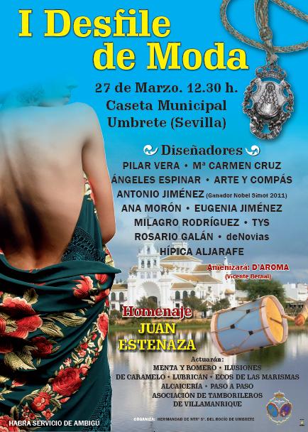 El próximo domingo, 27 de marzo, tendrá lugar en la Caseta Municipal el I Desfile de Moda, organizado por la Hermandad del Rocío de nuestro pueblo. Desde las 12,30 h. está previsto un amplio elenco de actividades. En el desfile de moda participarán los diseñadores Pilar Vera, Mª Carmen Cruz, Ángeles Espinar, Arte y Compás, Antonio Jiménez (Ganador novel Simot 2011), Ana Morón, Eugenia Jiménez, Milagro Rodríguez, Tys, Rosario Galán, deNovias e Hípica Aljarafe.