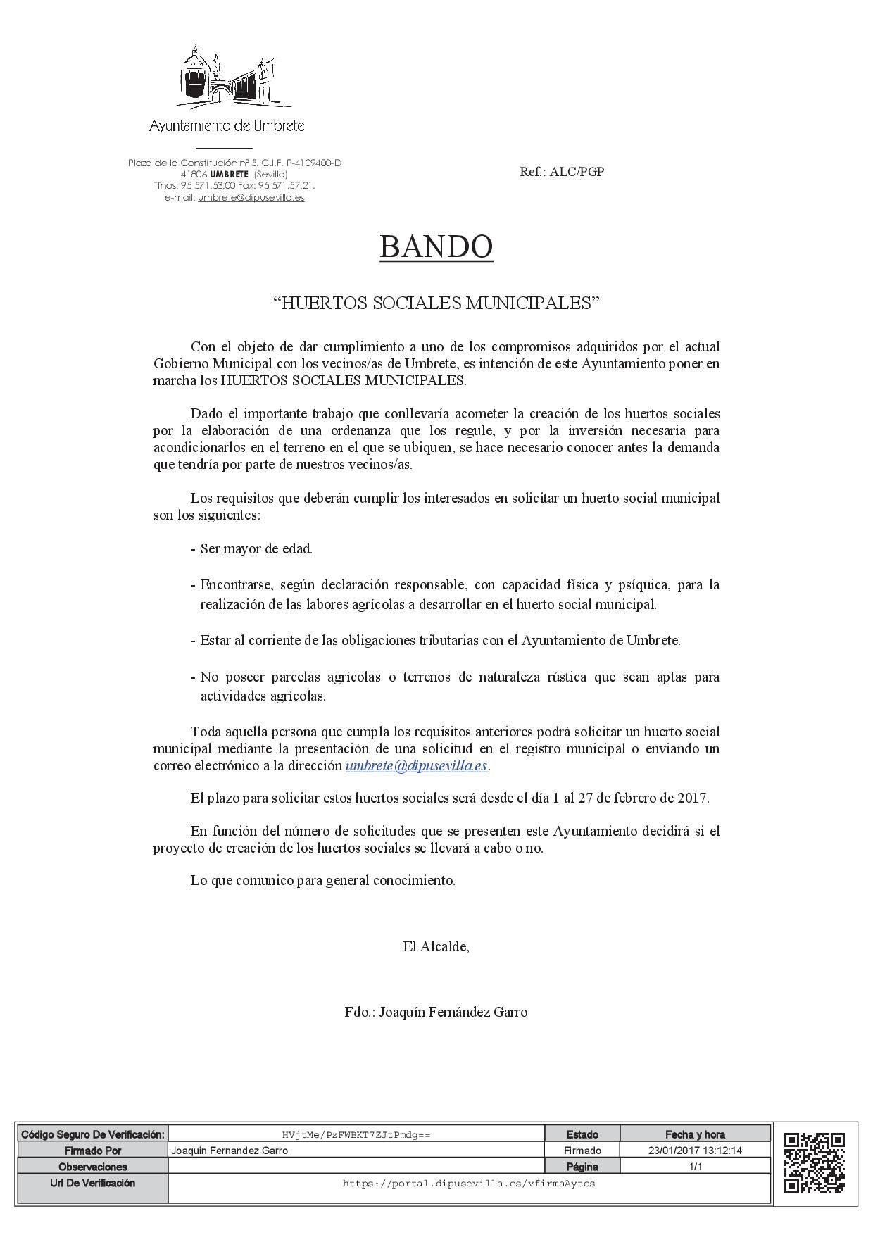 Imagen Ubicación Categoría noticia Medio Ambiente Mostrar en el carrusel de la sección No Fecha Lun, 30/01/2017 - 11:52 Más información http://www.umbrete.es/es/actualidad/noticias/HUERTOS-SOCIALES-MUNICIPALES/