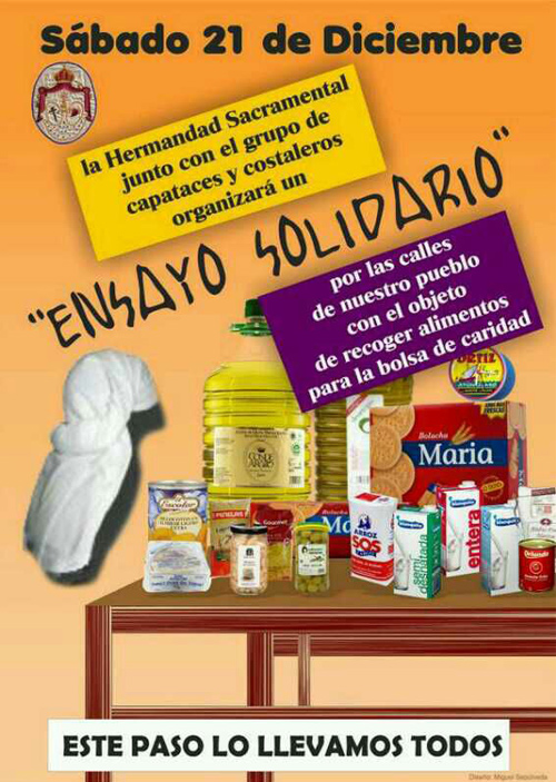 La Hermandad Sacramental de Umbrete y su grupo de capataces y costaleros organiza para este sábado 21 de diciembre un ensayo solidario. La iniciativa pretende que conforme recorran las calles de Umbrete los vecinos de la localidad aporten alimentos que irán destinados a la bolsa de caridad que pone en marcha la Hermandad.