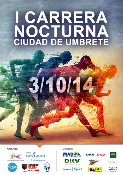 El Ayuntamiento de Umbrete, a través de la Delegación de Deportes, del Centro Deportivo SUPRALJARAFE y el Club de Atletismo Verjetum organiza la I Carrera Popular Nocturna que se celebrará en Umbrete el día 3 de octubre de 2014 , pudiendo participar cualquier persona que lo desee y acepte la presente normativa, previo inscripción de 5,00 € para todas las categorías excepto cadetes, infantiles, alevín, benjamín y pitufos que será la inscripción gratuita.