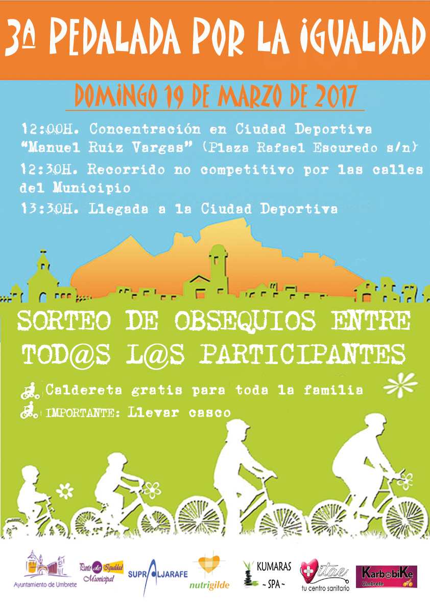 El próximo domingo 19 de marzo, tendrá lugar una divertida jornada por una buena causa, un día lleno de actividades para pasar en familia con la igualdad como trasfondo. Disfrutaremos de un recorrido en bicicleta por las calles del municipio, con un sorteo de obsequios entre todos los dorsales. Al finalizar, degustaremos una caldereta gratis para toda la familia.