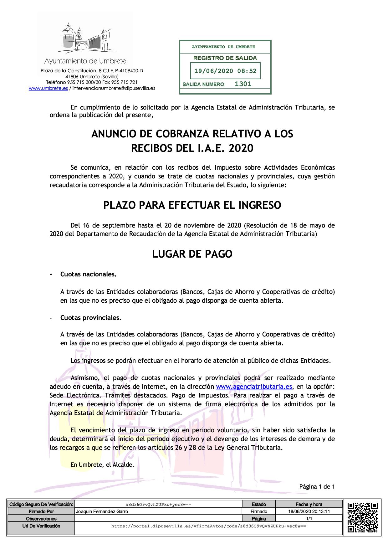 Imagen Ubicación Categoría noticia Hacienda Mostrar en el carrusel de la sección No Fecha Lun, 14/09/2020 - 11:41 Más información http://www.umbrete.es/es/actualidad/noticias/ANUNCIO-DE-COBRANZA-RELATIVO-A-LOS…