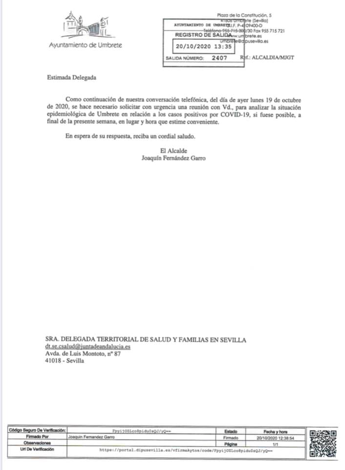 El Alcalde de Umbrete solicitó ayer una reunión de urgencia con la Delegada Territorial de Salud y Familias en Sevilla, para analizar la situación epidemiológica de Umbrete en relación a los casos positivos por Covid19.