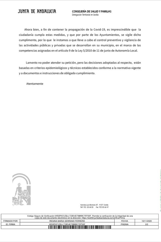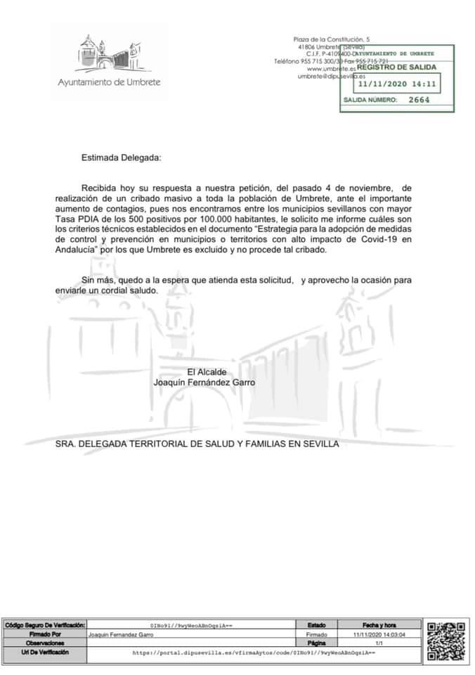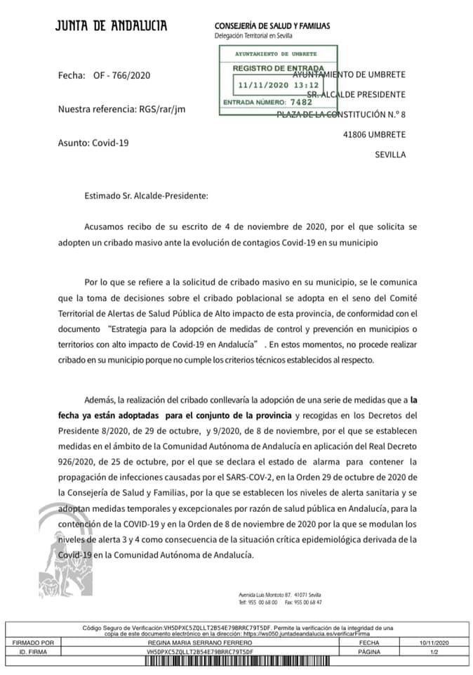 Hoy hemos recibido la respuesta de la Delegada Territorial de Salud y Familias a la solicitud del Alcalde de Umbrete, Joaquín Fernández Garro, de realización de un cribado masivo en nuestro municipio, ante el preocupante aumento de los contagios por Covid19 .
