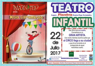 IMAGINATELO presenta: " Mola Carambola" 22 DEJULIO 2017 -- Hora: 22:00, QUINCENA CULTURAL Lugar: Plazoleta Teatro Municipal Pepe Fernández. c/ Sevilla,19 Alan Brito tenía un sueño, Convertirse en un GRAN ARTISTA. Una noche mientras duerme sueña que el CIRCO llega a su ciudad y que él se convierte en el protagonista de aquel maravilloso sueño. Organiza: Ayto. de Aznalcóllar--Delegación de Cultura Colabora: Diputación de Sevilla TEATRO INFANTIL FACTORIA DE TRAPOS presenta: " Show en la Granja" 28 DEJULIO 2017 -- Hora: 22:00, QUINCENA CULTURAL Lugar: Plazoleta Teatro Municipal Pepe Fernández. c/ Sevilla,19 Los payasos -granjeros- han preparado un espectáculo con sus animales de gomaespuma. Uno de ellos nos contará una tierna historia que nos enseñará que dos no pelean si uno no quiere. Juegos, bailes y canciones junto con una participativa función de títeres consiguen que todo el mundo se divierta Organiza: Ayto. de Aznalcóllar--Delegación de Cultura Colabora: Diputación de Sevilla EXPOSICIÓN FLAMENCO PROJECT Colección de fotografías de escenas del flamenco. Proyecto comisariado por Steve Kahn Del 17 al 31de Julio 2017 Horarios: Mañanas: de 11 a 13 ( previo aviso en el Ayto.) Tardes: Lunes-Miercoles yViernes de 20:00 a 21:00 h. *Para visitas para grupos en diferentehorario, ponerse en contacto con el Ayto. QUINCENA CULTURAL Lugar: Teatro Municipal Pepe Fernández. c/ Sevilla,19Imagen