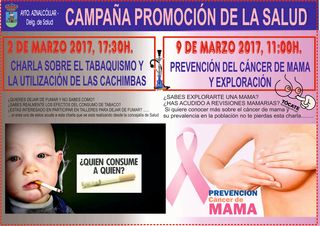 2 de MARZO 2017, 17:30h. CHARLA SOBRE EL TABAQUISMO Y LA UTILIZACIÓN DE LAS CACHIMBAS Imparte: Personal Sanitario del Distrito Aljarafe Norte ¿QUIERES DEJAR DE FUMAR Y NO SABES COMO? ¿SABES REALMENTE LOS EFECTOS DEL CONSUMO DE TABACO? ¿ESTAS INTERESADO EN PARTICIPAR EN TALLERES PARA DEJAR DE FUMAR? ...... ....si eres uno de estos acude a esta charla que se está realizando desde la concejalía deSalud 9 de MARZO 2017, 11:00h. PREVENCIÓN DEL CÁNCER DE MAMA Y EXPLORACIÓN Imparte: Personal Sanitario del Distrito Aljarafe Norte SABES EXPLORARTE UNA MAMA? ¿HAS ACUDIDO A REVISIONES MAMARIAS? Si quiere conocer más sobre el cáncer de mama y su prevalencia en la población no te pierdas esta charla........ Lugar. Teatro Municipal Pepe Fernández AYTO. AZNALCÓLLAR - Delg. de SaludImagen