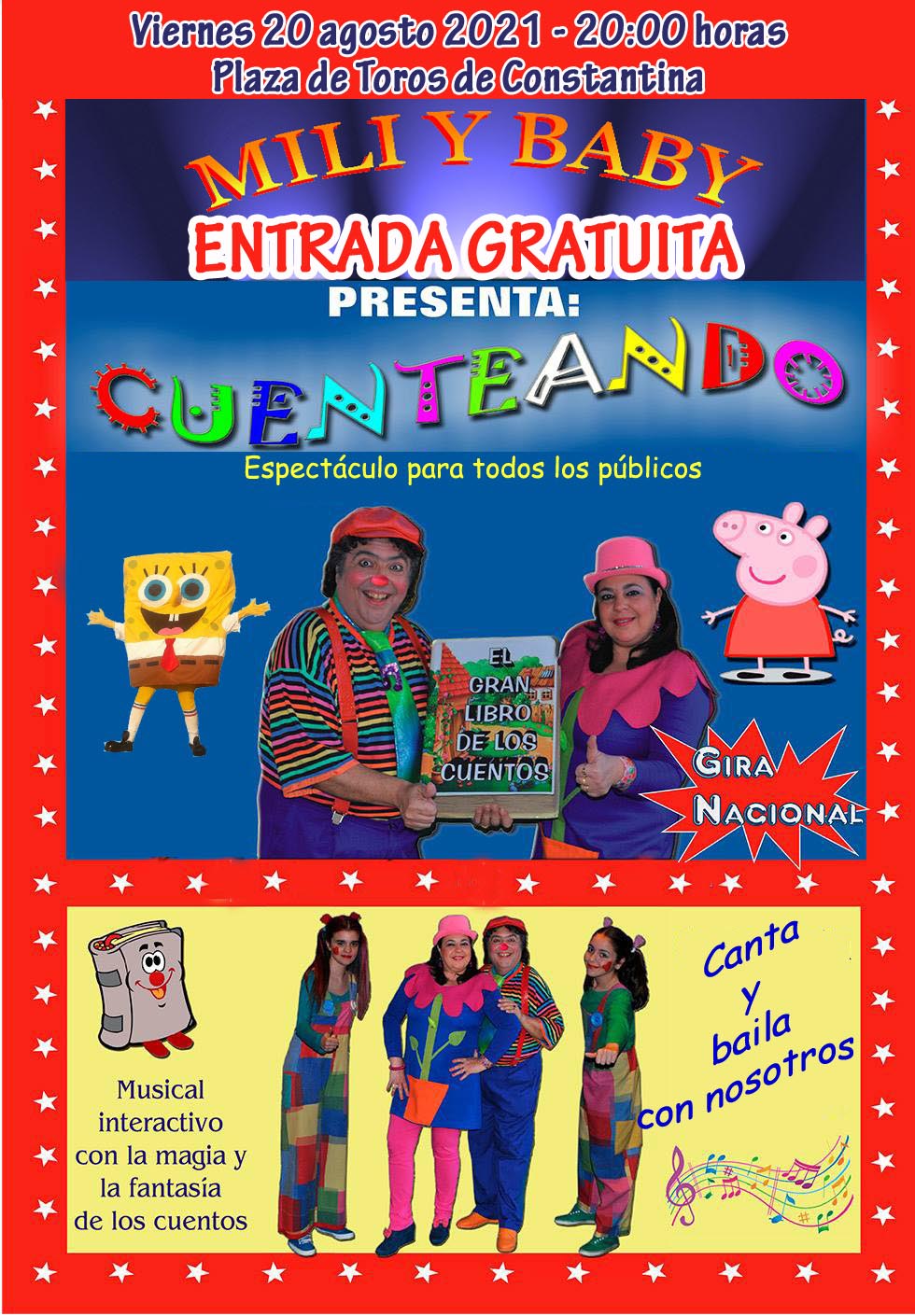 El Ayuntamiento de Constantina, dentro de su programación "Agosto en Constantina" te ofrece el viernes 20 de agosto, a las 20:00 horas, en la Plaza de Toros el Espectáculo "Cuenteando" a cargo de Mily y Baby.