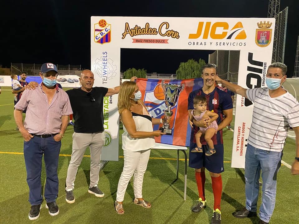 La alcaldesa de la localidad, Ángeles García, y el primer teniente de alcalde y delegado municipal de Deportes, Alonso Javier Mesa, han entregado los trofeos a ambos equipos tras la finalización del partido.