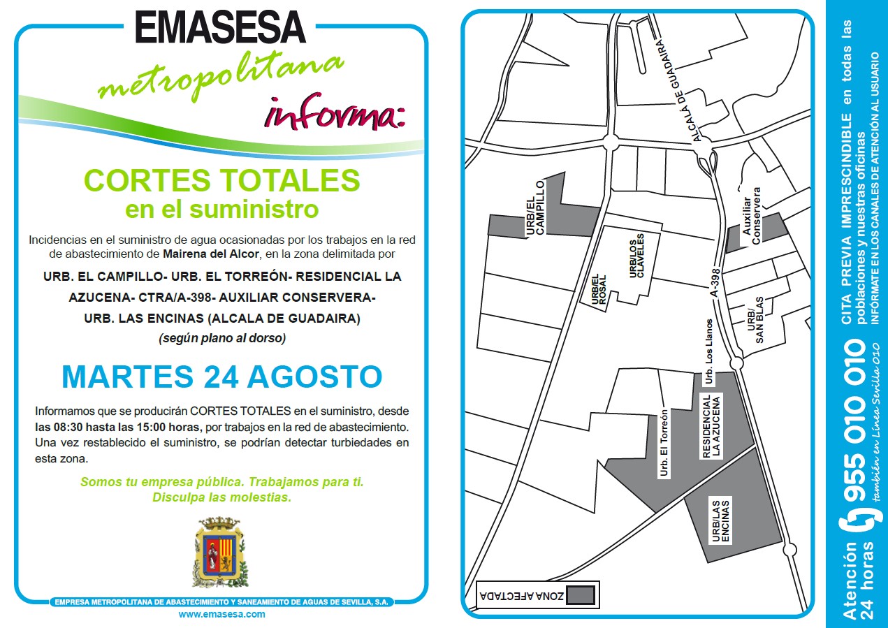 Emasesa Metropolitana informa que por trabajos en la red de abastecimiento, el martes día 24 de agosto, de 8.30 a 15 horas, se producirán cortes totales en el suministro de agua en la zona comprendida por las urbanizaciones el Campillo, el Torreón, residencial la Azucena, carretera A-398, Auxiliar Conservera y urbanización las Encinas.