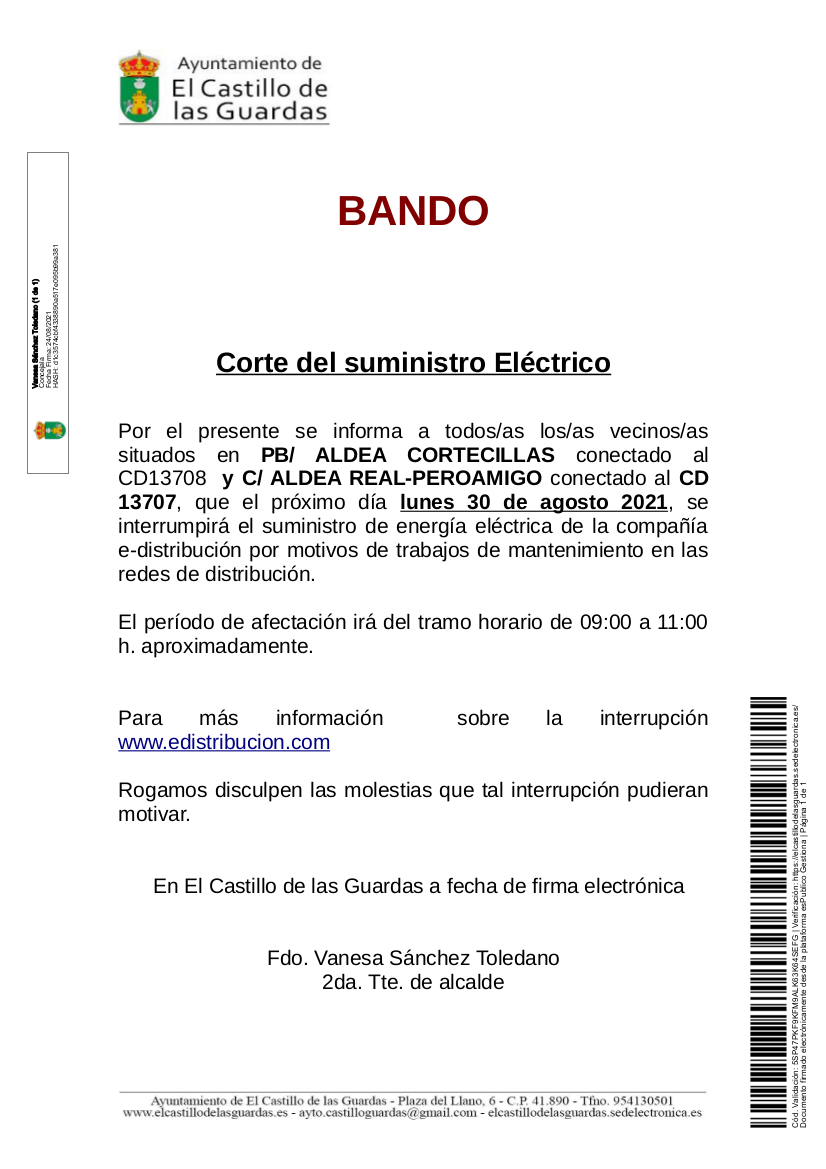 Por el presente BANDO se informa a todos/as los/as vecinos/assituados en PB/ ALDEA CORTECILLAS conectado al CD13708 y C/ ALDEA REAL-PEROAMIGO conectado al CD13707, del corte en el suministro eléctrico con motivo de trabajos de mantenimiento en las redes de distribución que tendrá lugar el lunes 30 de agosto 2021.