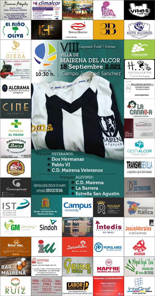 El Ayuntamiento de Mairena del Alcor colabora con la celebración del VIII Campeonato Fútbol-7 Veteranos Villa de Mairena del Alcor. Será el 18 de septiembre a las 10.30 horas en el campo de fútbol Jozabed Sánchez Ruiz.