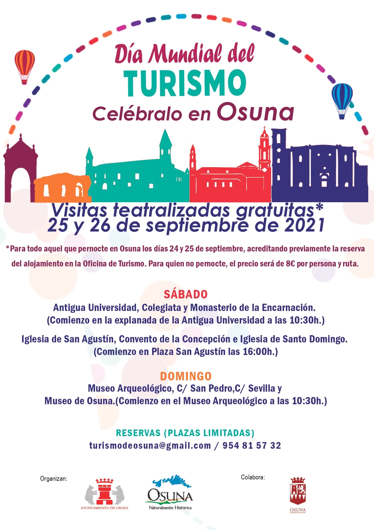Con motivo del Día Mundial del Turismo, que se celebra el próximo lunes, 27 de septiembre, Osuna va a conmemorar esta efemérides con una serie de actividades que se van a desarrollar este fin de semana, y entre las que destacan las visitas teatralizadas que tendrán lugar en diferentes espacios históricos y patrimoniales del municipio.