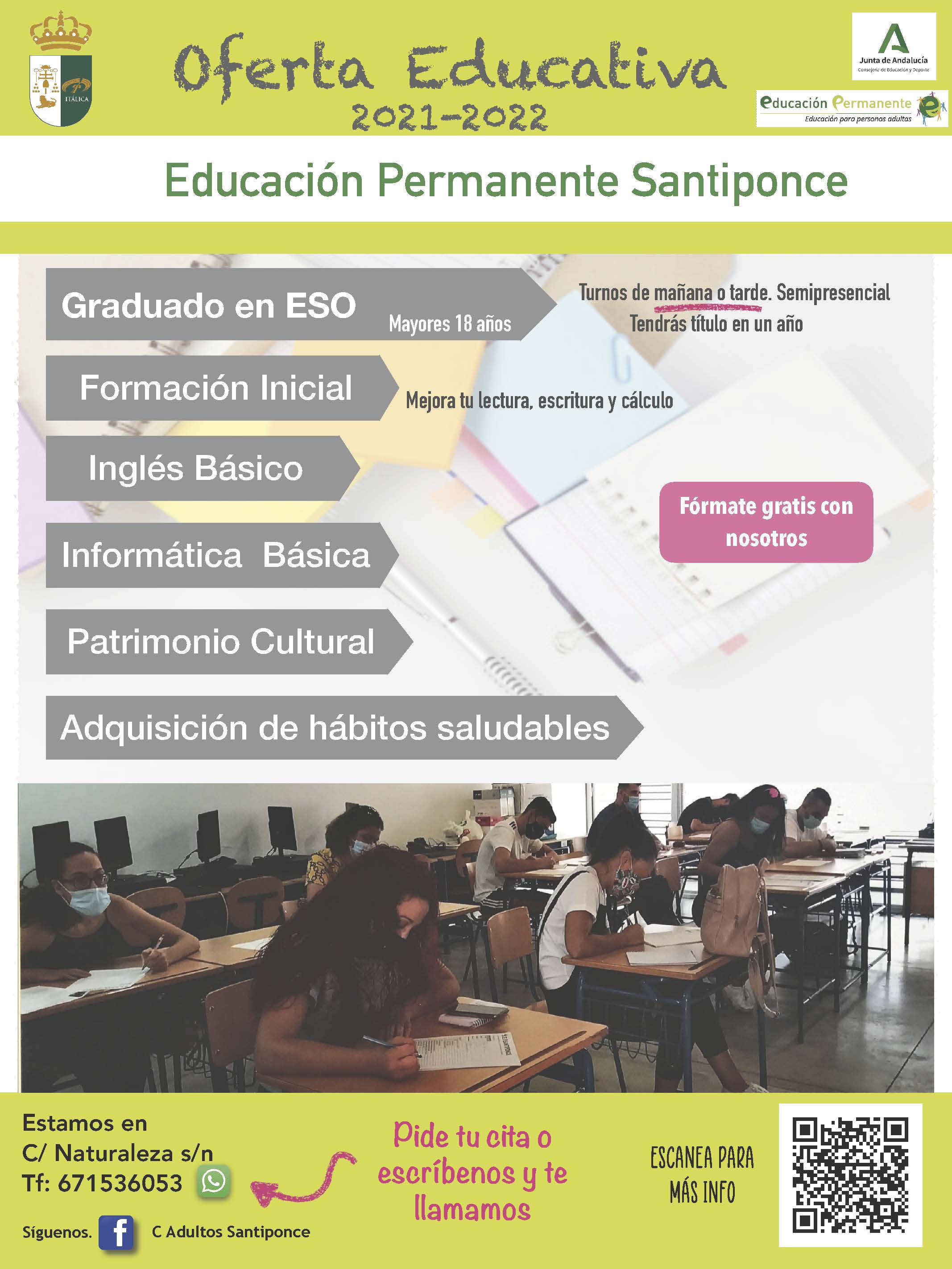 Desde la Sección de Educación Permanente de Santiponce (C. de adultos) nos envían la oferta formativa para el curso actual, desde ahora y hasta el 13 de Septiembre puedes inscribirte en este periodo extraordinario de matrícula (última oportunidad para quienes quieran apuntarse)