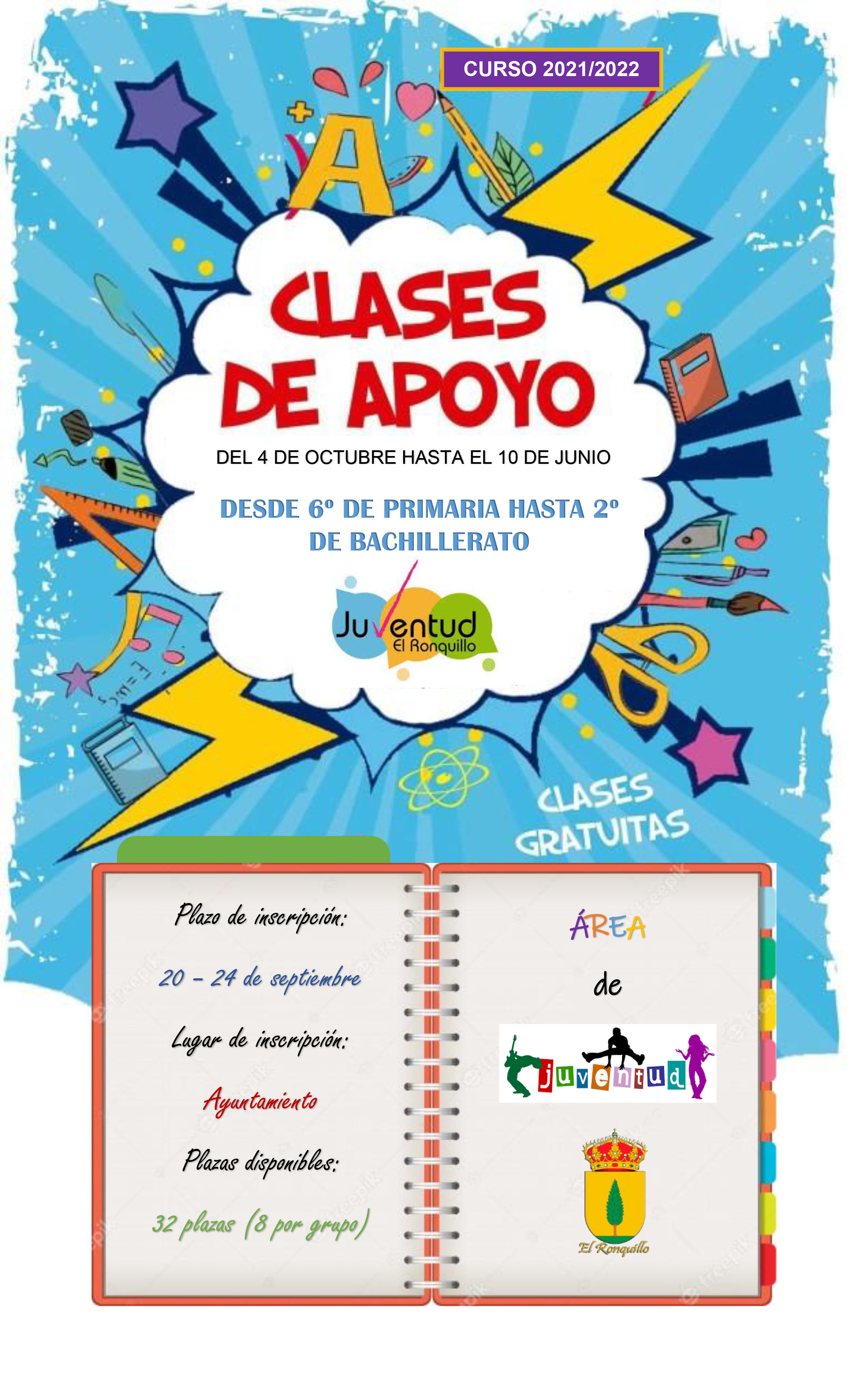 PLAZAS LIMITADAS a 32 (8 niñ@s por grupo). Las plazas se adjudicarán por riguroso orden de inscripción. La inscripción solo se podrá realizar de forma presencial rellenando una ficha que se recogerá y entregará en el Ayuntamiento. APERTURA DE INSCRIPCIONES LUNES 20 de septiembre a las 08:00 horas.