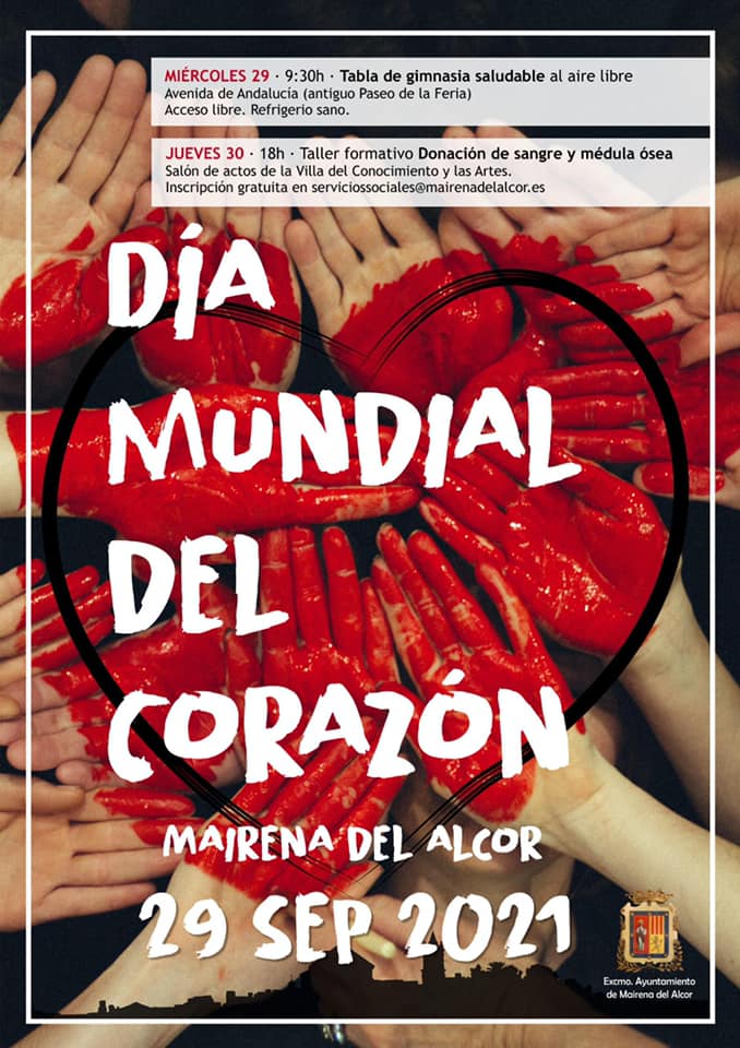 La Delegación de Sanidad del Ayuntamiento de Mairena del Alcor celebra el Día Mundial del Corazón con un programa de actividades que comienza hoy miércoles con una tabla de gimnasia saludable, a las 9.30 horas en el antiguo Paseo de la Feria. Mañana jueves tendrá lugar un taller formativo, en el que se abordará la donación de sangre y médula ósea, a las 18 horas en la Villa del Conocimiento y las Artes. La inscripción es gratuita, escribiendo a serviciossociales@mairenadelalcor.es