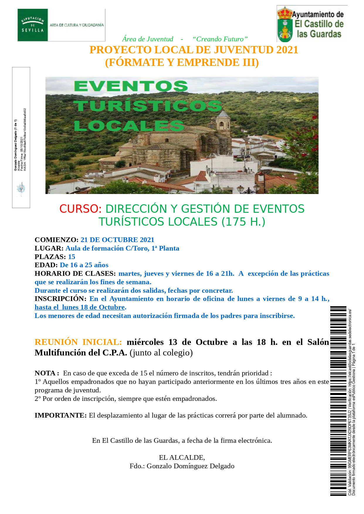 La Delegación de Juventud del Ayuntamiento pondrá próximamente en marcha, un Curso de Dirección y gestión de eventos turísticos locales de 175 horas, programa incluido en los Proyectos Locales de Juventud 2021 de la Diputación Provincial de Sevilla.
