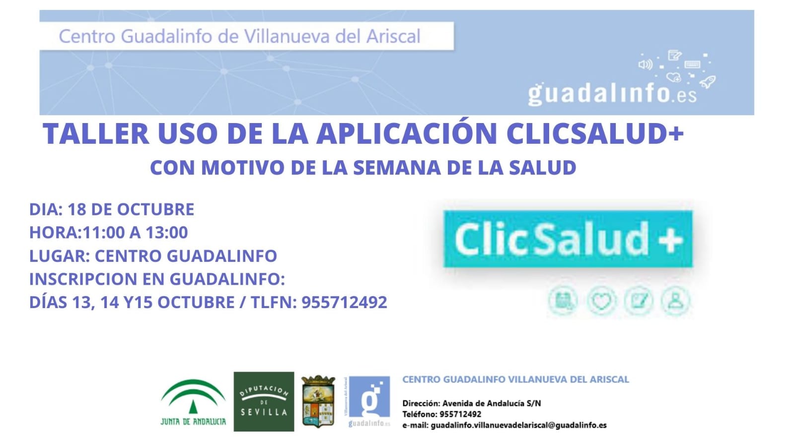 Dentro de las actividades programadas con motivo de la III Semana de la Salud, el próximo lunes 18 de octubre tendrá lugar en el Centro Guadalinfo el Taller "Manejo de la aplicación ClicSalud ", impartido por la técnica de Guadalinfo, Amparo Lindes. ¡Participa!