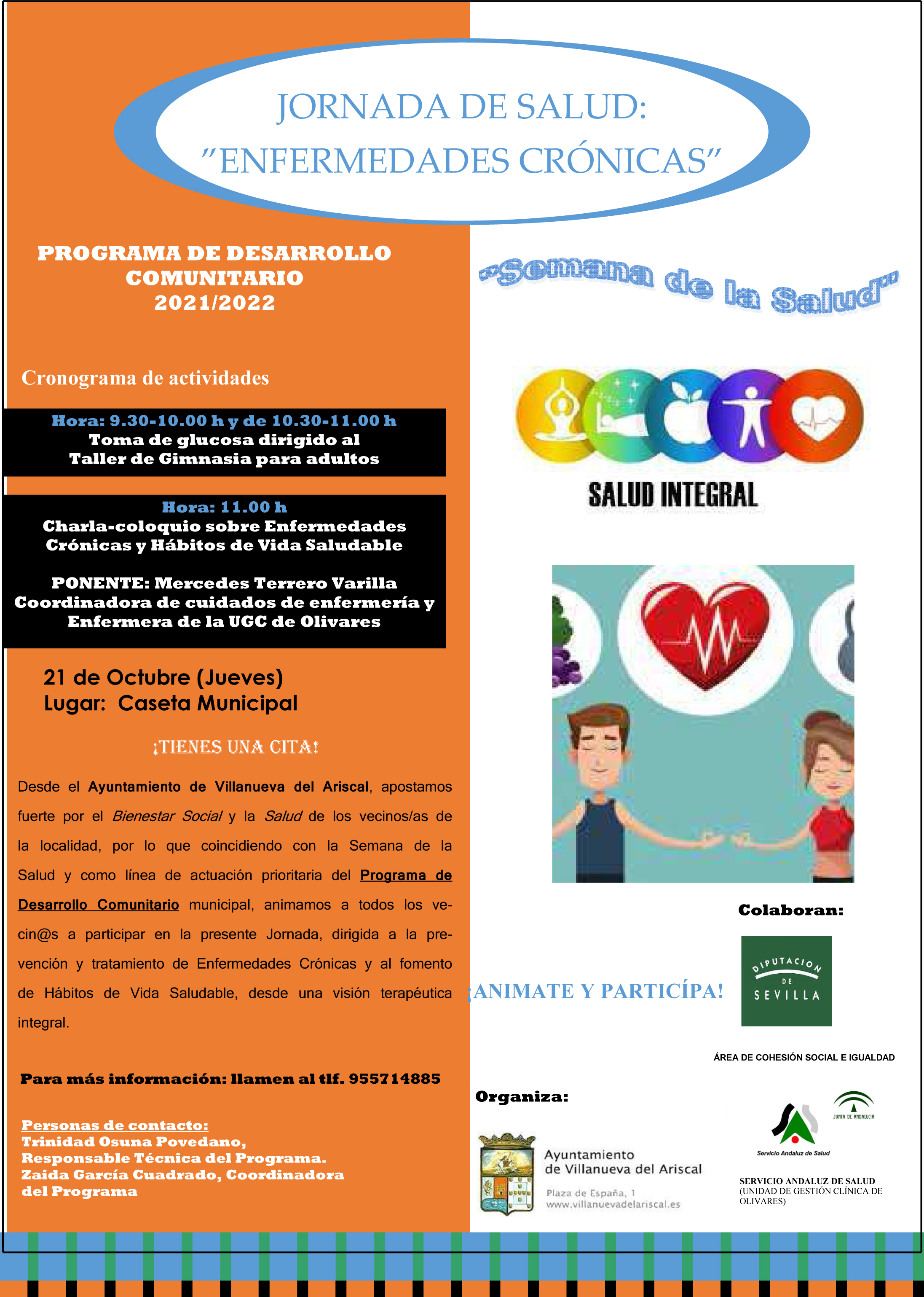 Dentro de las actividades programadas con motivo de la III Semana de la Salud, el próximo jueves 21 de octubre tendrá lugar en la caseta municipal la Charla "Enfermedades crónicas", impartida por D.ª Mercedes Terrero Varilla, coordinadora de cuidados de enfermería y enfermera de la UGC Olivares. ¡Participa!