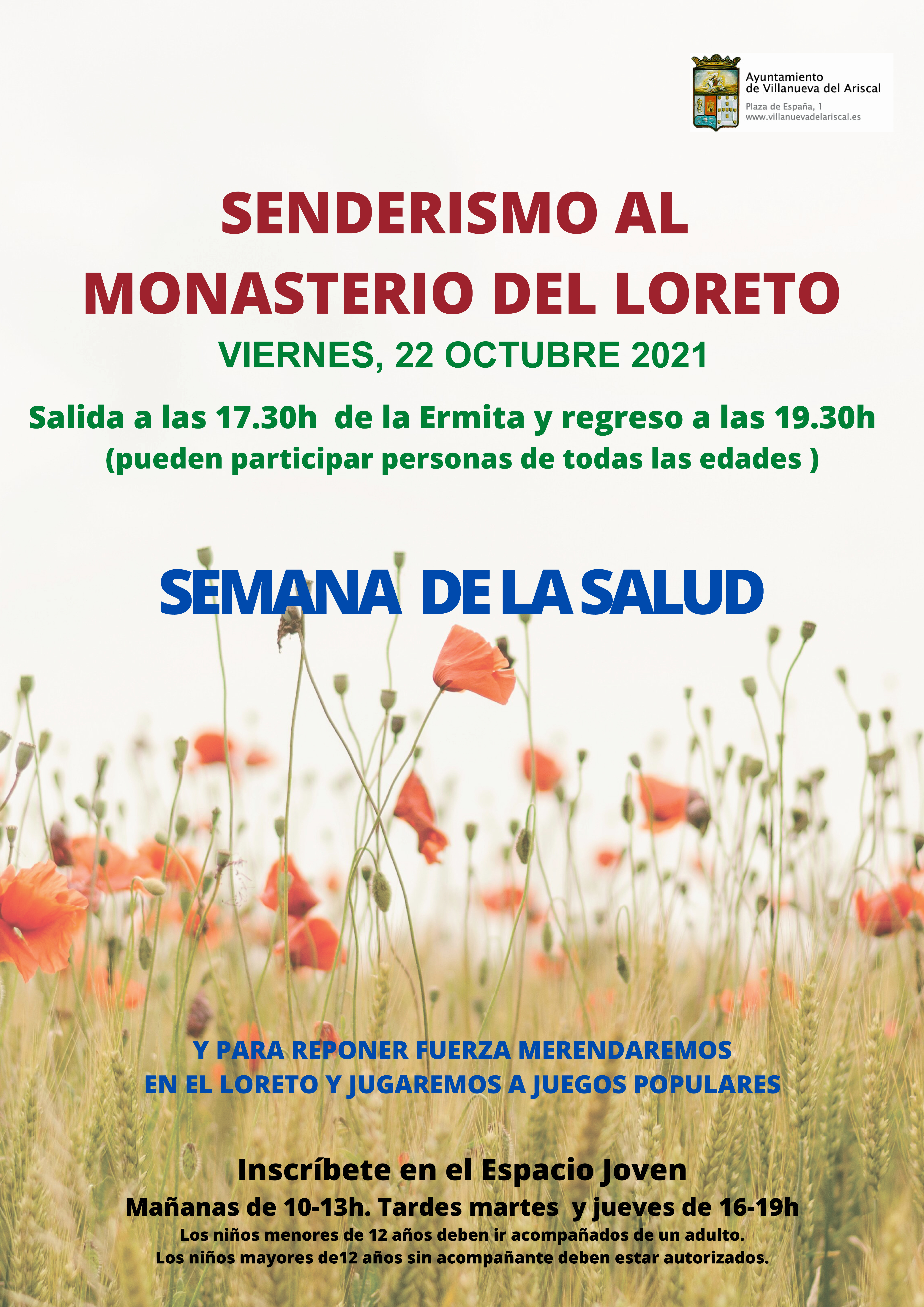Dentro de las actividades programadas con motivo de la III Semana de la Salud, el próximo viernes 29 de octubre tendrá lugar una ruta de senderismo para todas las edades al Monasterio de Ntra. Sra. de Loreto. Se partirá a las 17:30 h desde la Ermita y se regresará dos horas después. Allí tendremos una merienda y juegos populares. Inscríbete en el Espacio Joven por las mañanas de 10-13 h y por las tardes los martes y jueves de 16-19 h. Pregunta por Mónica. ¡Participa!