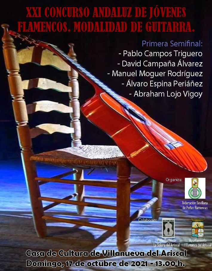 Tenemos el privilegio de tener en nuestra localidad el próximo domingo la primera semifinal del XXI Concurso Andaluz de Jóvenes Flamencos de la modalidad de Guitarra. El concurso, organizado por la Federación Sevillana de Peñas Flamencas cuenta con la colaboración de la Peña Flamenca La Solera del Ariscal y de la delegación de Cultura de nuestro Ayuntamiento. Comenzará a las 13.00 horas en la Casa de Cultura. ¡Te esperamos! #VillanuevaDelAriscal #ElPuebloQueTúMereces #ConcursoAndaluzDeJóvenesFlamencosGuitarra #FederaciónSevillanaDePeñasFlamencas #PeñaFlamencaLaSoleraDelAriscal