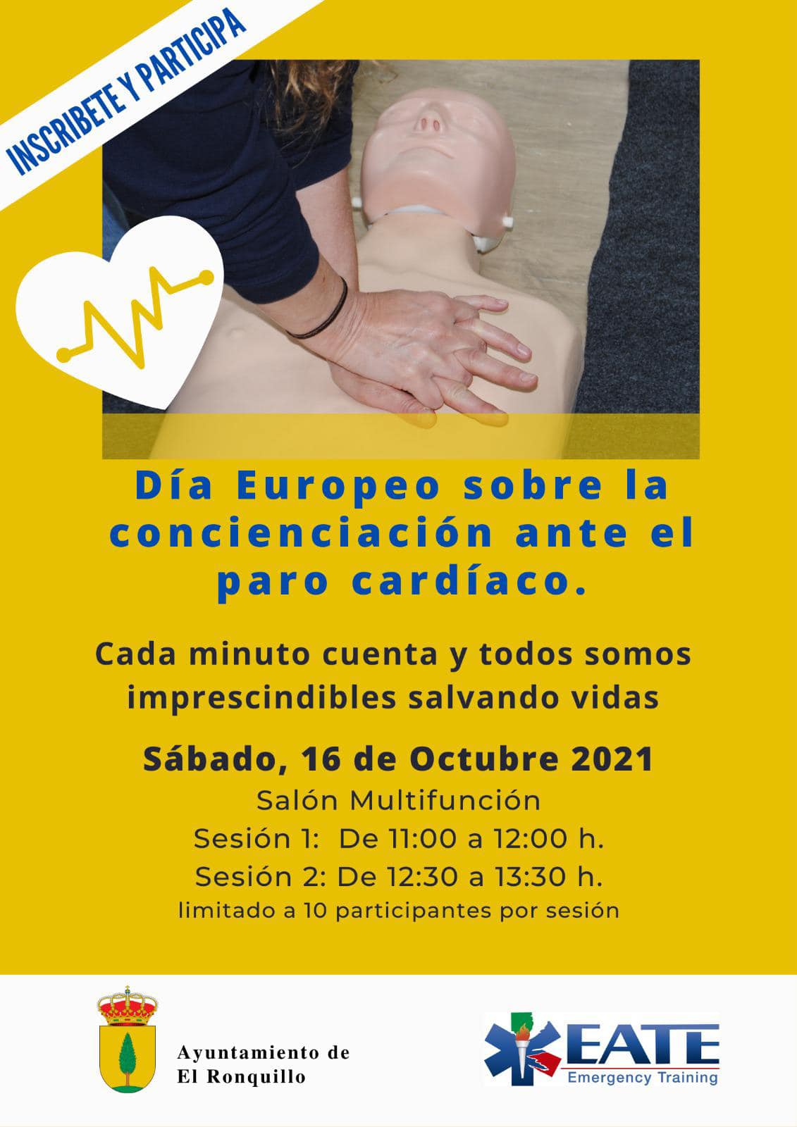 Desde el Ayuntamiento de El Ronquillo y EATE (Escuela Andaluza de Técnicos en Emergencias), hemos pensado que este día es el más indicado para celebrar un acto que permita, en dos frentes bien marcados, sensibilizar a los ciudadanos del Ronquillo sobre el problema de la parada cardiaca y, ante ellos, desmitificar el uso de los desfibriladores externos semiautomáticos (DESA) y la aplicación precoz de la Reanimación Cardiopulmonar (RCP). Para ello, el 16-octubre, de 11:00 a 13:30h, en dos sesiones, se podrá acceder a unas jornadas didácticas sobre los pasos a seguir para una correcta actuación en caso de asistir a una persona que sufra un paro cardíaco.