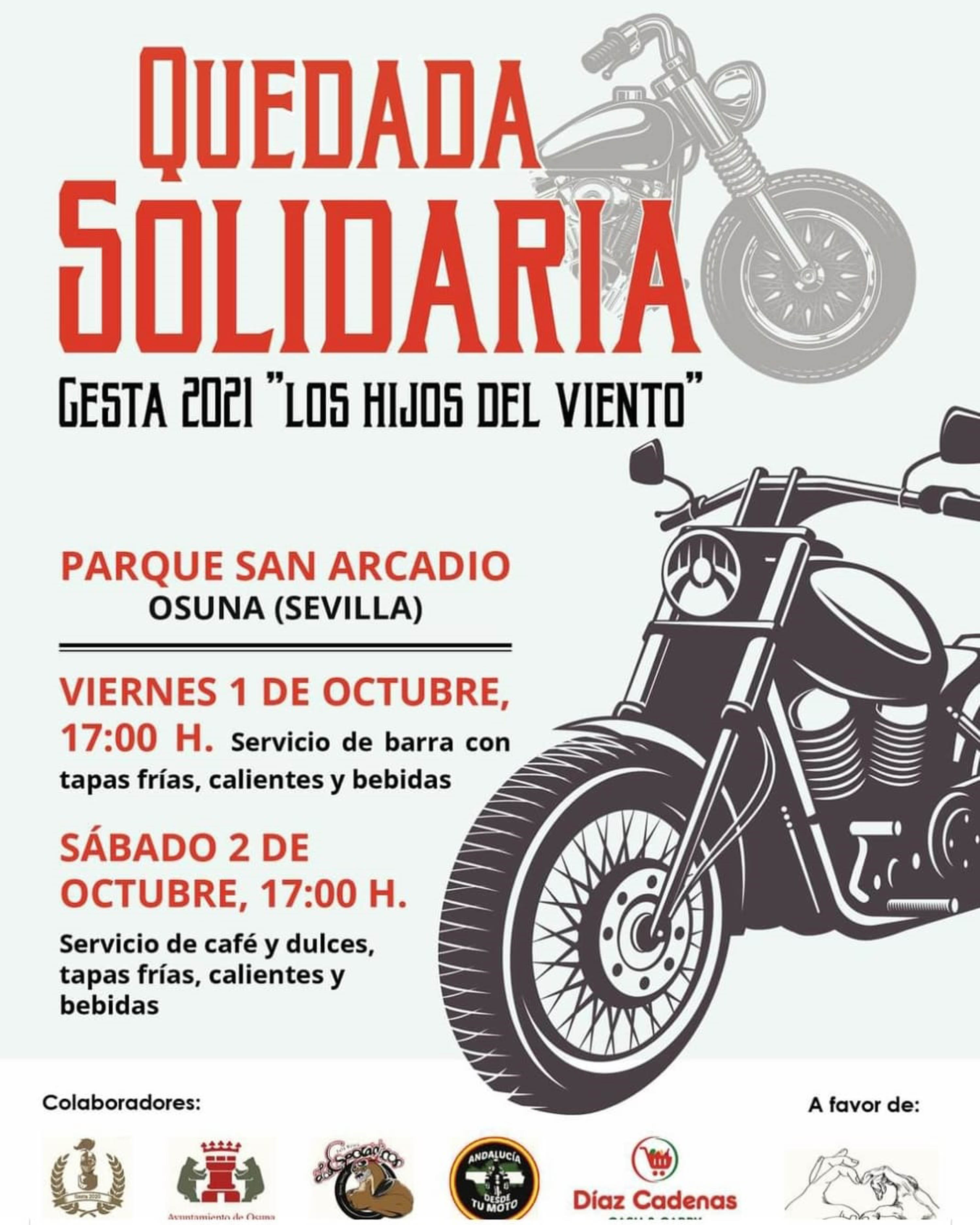 Además, La Gesta 2021 "Los Hijos del Viento", tendrá un marcado carácter solidario, pues todos los beneficios que se obtengan de la barra que, para tal fin se ubicará en el Parque de San Arcadio, serán destinados a la Asociación de Familiares de Enfermos de Alzheimer y otras Demencias, AFA-OSUNA, de ahí que, tanto para el viernes como para el sábado, se haya organizado una quedada solidaria en el parque invitando a todos los aficionados al mundo del motor de la comarca y, por supuesto, a todos los vecinos y vecinas de Osuna y visitantes para que colaboran con esta causa.
