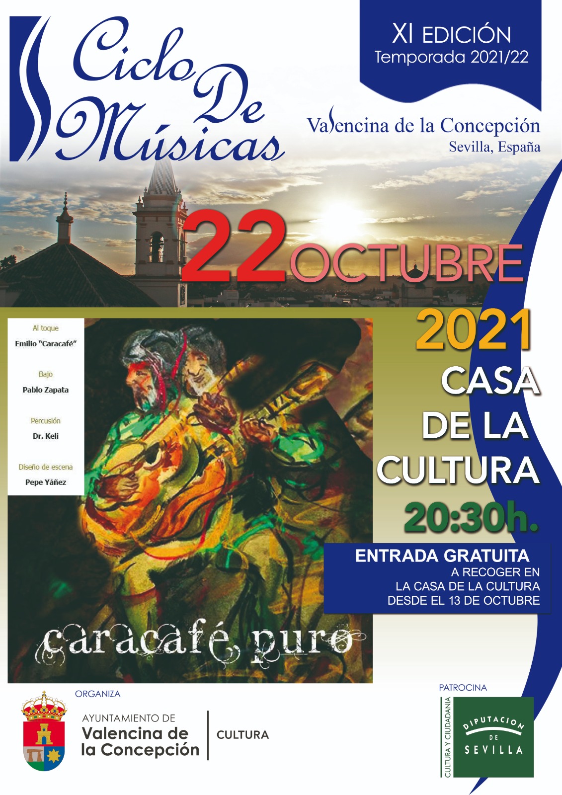 El Ayuntamiento de Valencina, a través de la Delegación de Cultura, informa de la celebración de la primera actuación del Ciclo de Músicas de Valencina de la Concepción en su XI Edición. El evento correrá a cargo de Caracafé y tendrá lugar el próximo 22 de octubre, en la Casa de la Cultura de Valencina, a las 20:30 horas.