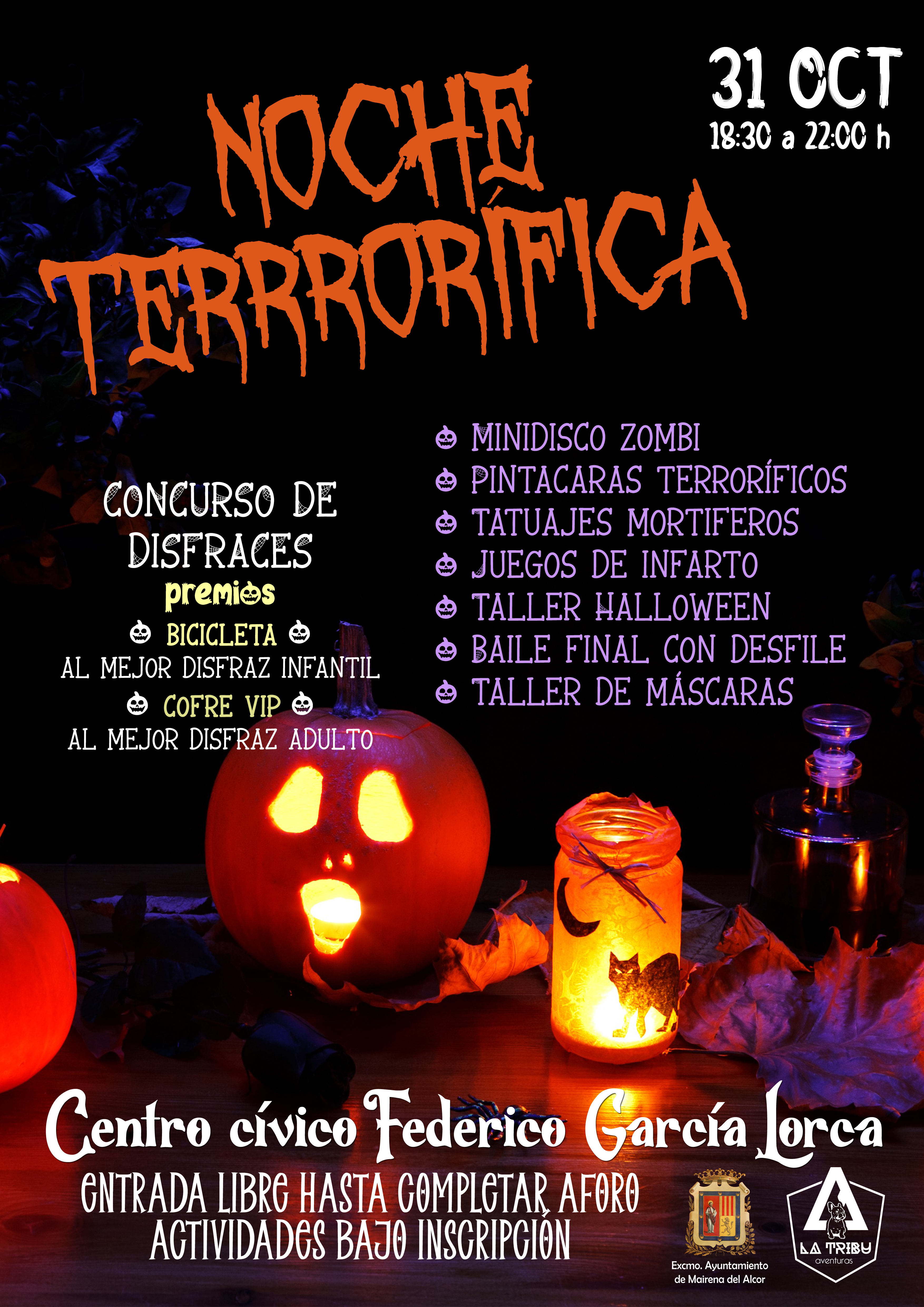 Minidisco Zombi, pintacaras terroríficos, tatuajes mortíferos, juegos de infarto, taller Halloween, taller de máscaras y bailes son solo algunas de las actividades que tendrán lugar en la Noche Terrorífica, el 31 de octubre de 18.30 a 22 horas en el Centro Cívico Federico García Lorca. La participación es gratuita, si bien, habrá que inscribirse allí mismo a cada una de las actividades que se desee participar.