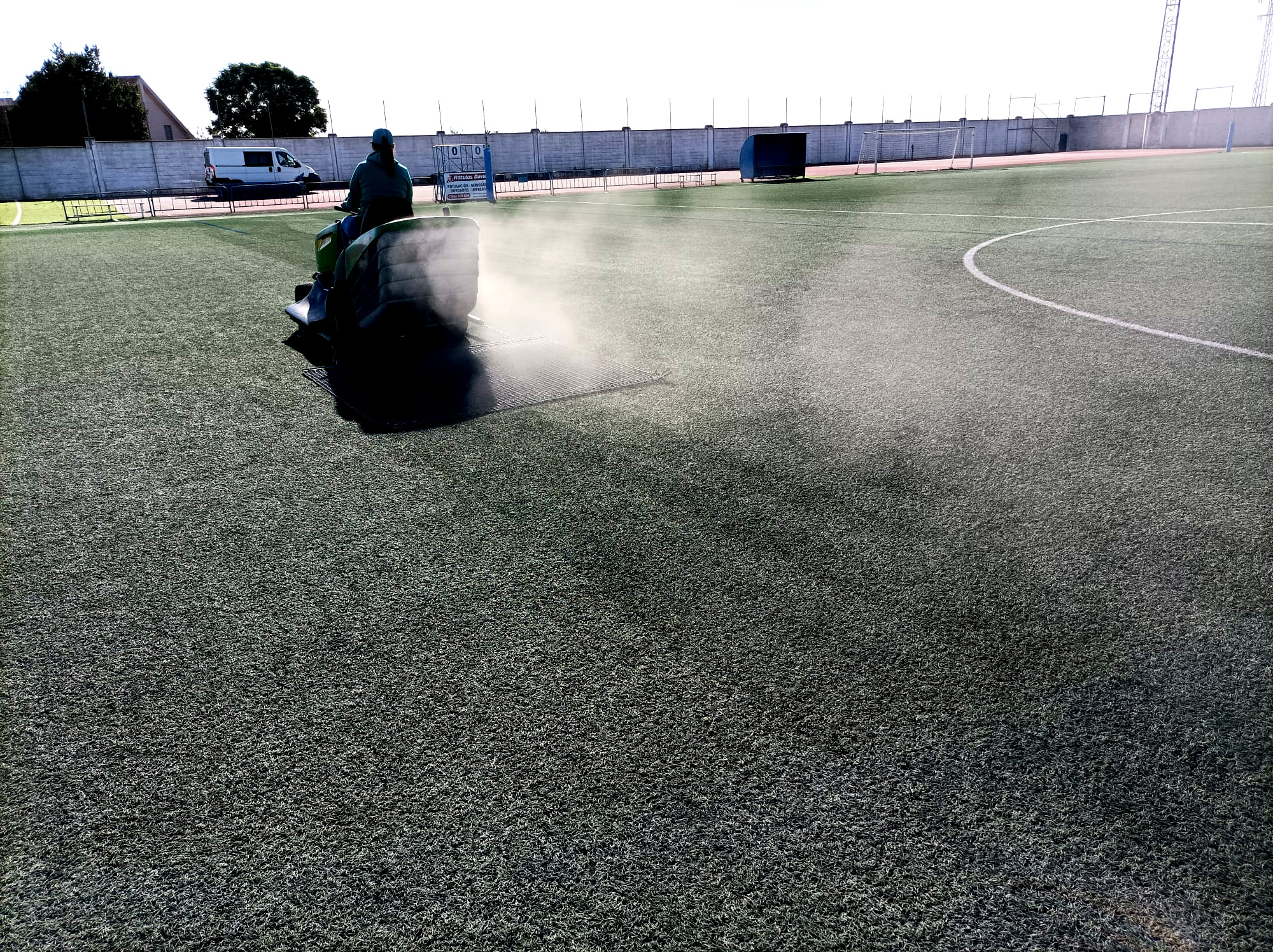 Una empresa especializada se ha encargado de inspeccionar el césped artificial, que ha sido sometido a una necesaria revisión de mantenimiento y cepillado, mediante la mecánica empleada por personal técnico, para mejorar su estado y ponerlo en buenas condiciones.